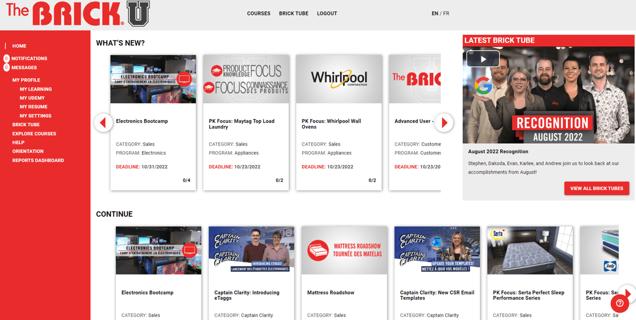 Brick University, notre plateforme de formation unique, fournit aux membres de notre équipe des modules de formation enrichis par des vidéos et des cours développés par Brick, qui sont fréquemment mis à jour. Grâce à plus de 5000 formations gratuites et accessibles à tous sur Udemy, l'accès à l'apprentissage est facilité.