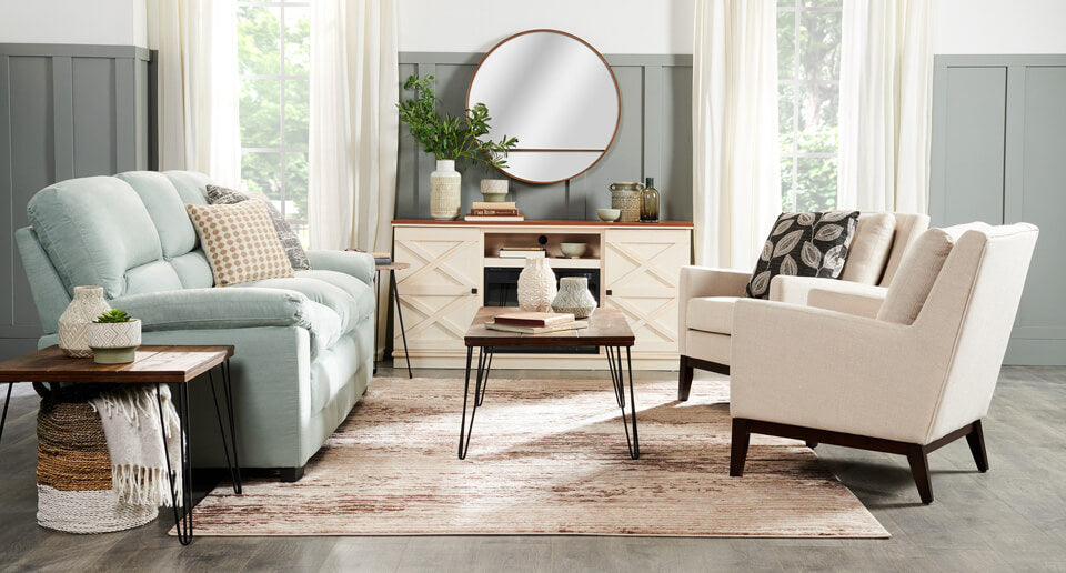 Le fait d’ajouter une carpette dans votre espace aidera à adoucir les teintes de bois variées et sera l’élément unifiant. S’il y a beaucoup de bois dans la pièce, une carpette peut offrir un repos visuel. De plus, la douceur d’une carpette peut aider à harmoniser les meubles avec le plancher en bois. Lorsque vous choisissez une carpette, assurez-vous qu’elle est assez grande pour ancrer les meubles. Vous pouvez y parvenir en vous assurant que vous pouvez mettre les pattes des meubles sur la surface de la carpette.