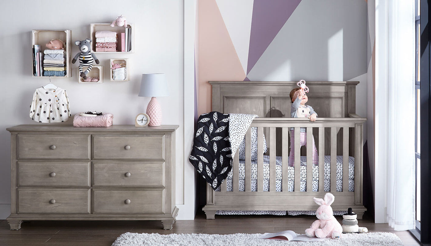 Utilisez des accessoires pastel pour rehausser une commode et des compartiments muraux dans cette chambre principale et chambre de bébé. Vous pouvez libérer de l'espace en éliminant la table à langer : utilisez simplement un tapis à langer portatif sur le lit.