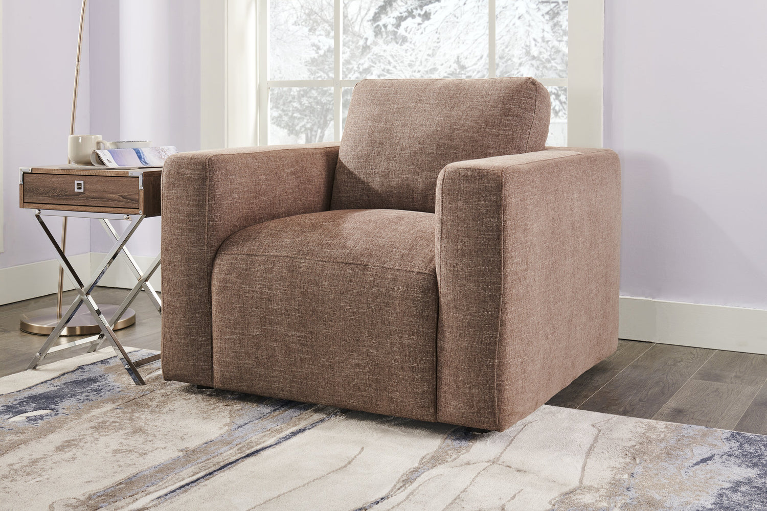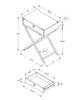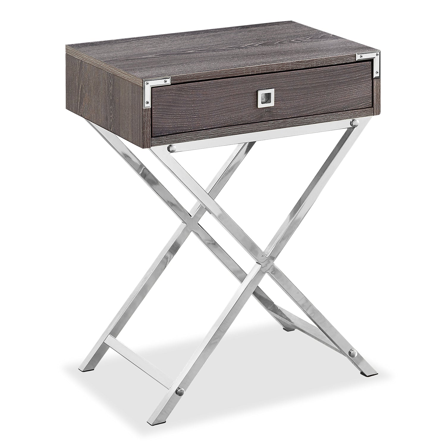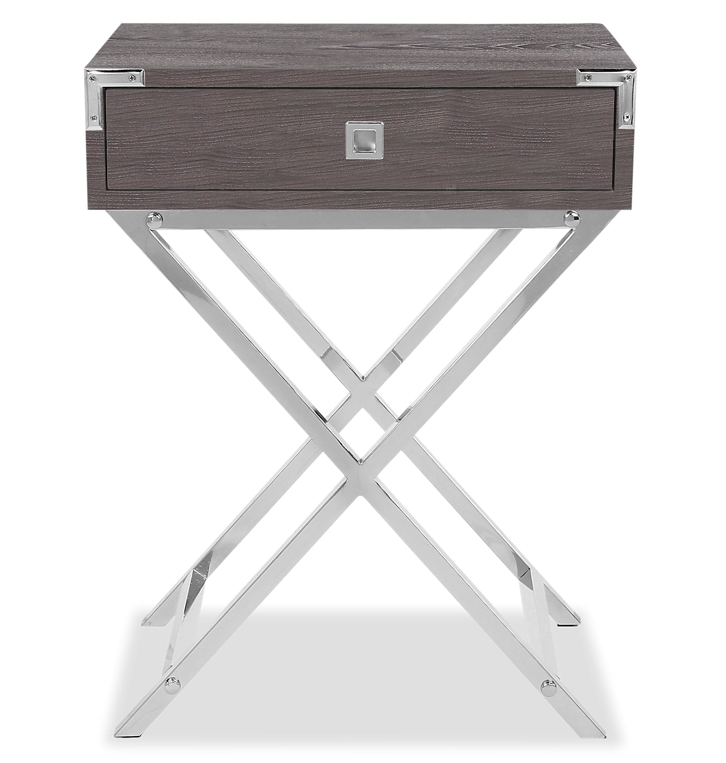 Détails décoratifs | l'armature ouverte en métal en forme de X ajoute un style contemporain à ce charmant meuble d'appoint. Une poignée de tiroir chromée assortie et des détails sur les coins complètent l'apparence urbaine. |