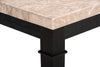 Les pattes et la ceinture de la table possèdent un fini teint gris brun qui a été appliqué à la brosse métallique afin de conférer une allure rustique et mature à ce meuble. Telle une chevelure poivre et sel, les nuances de gris aident à adoucir le brun, créant ainsi un agréable contraste avec le marbre beige.