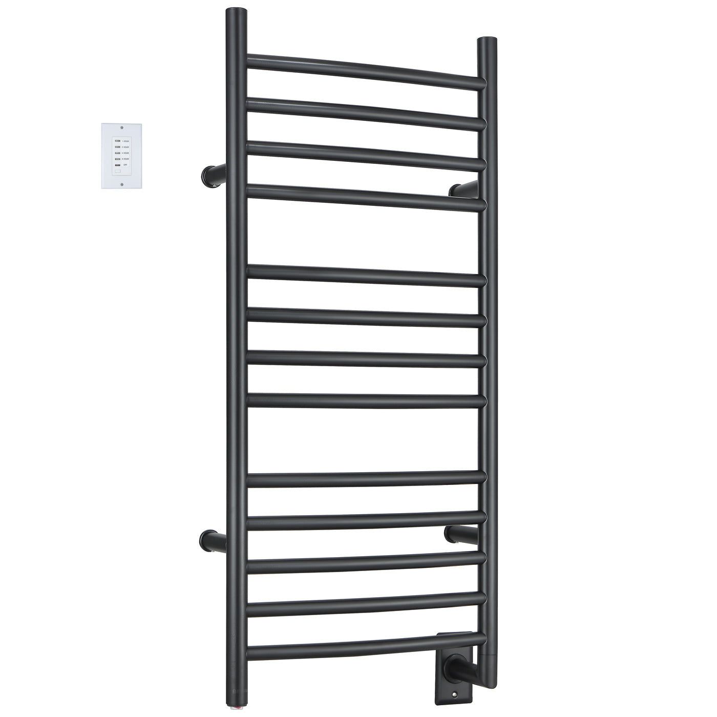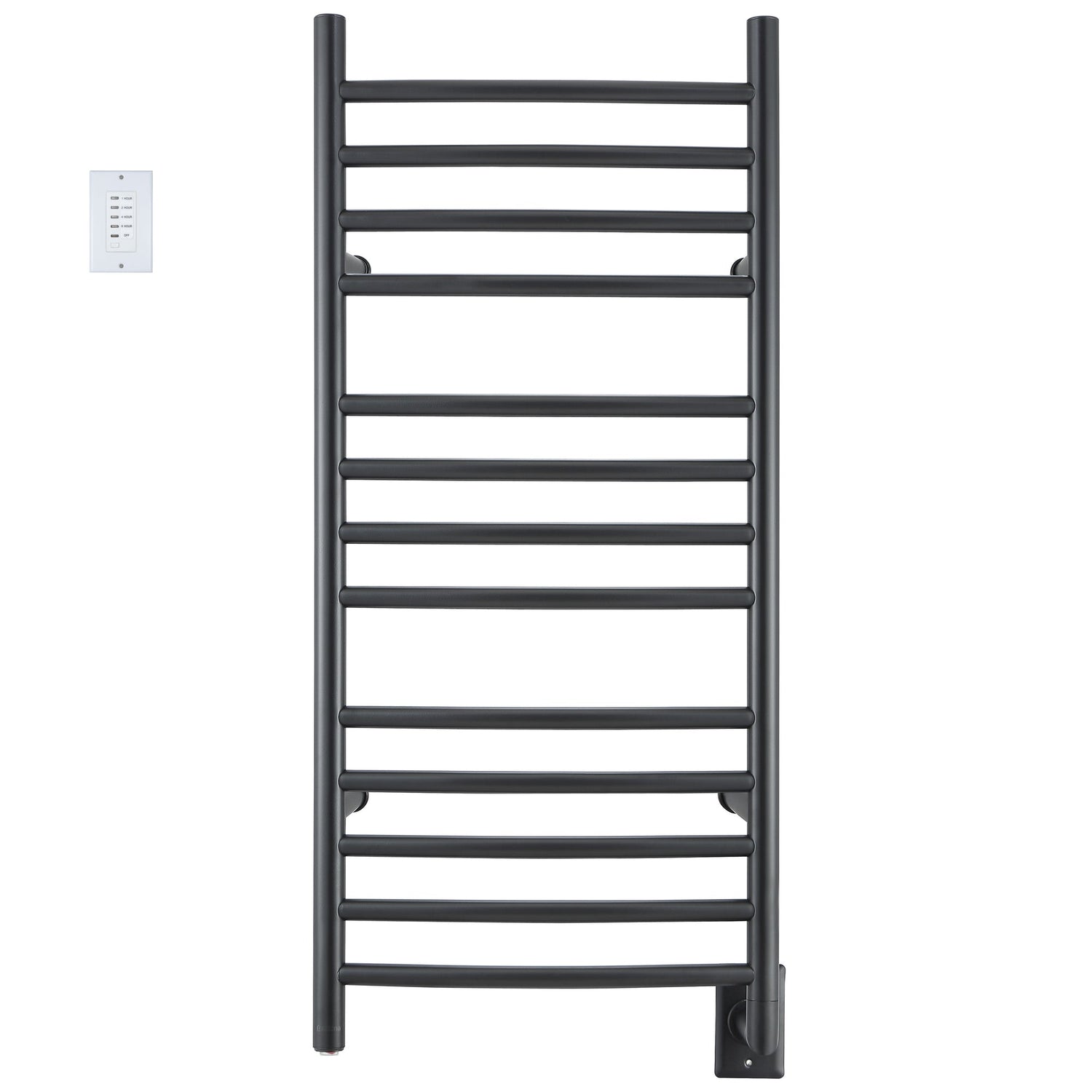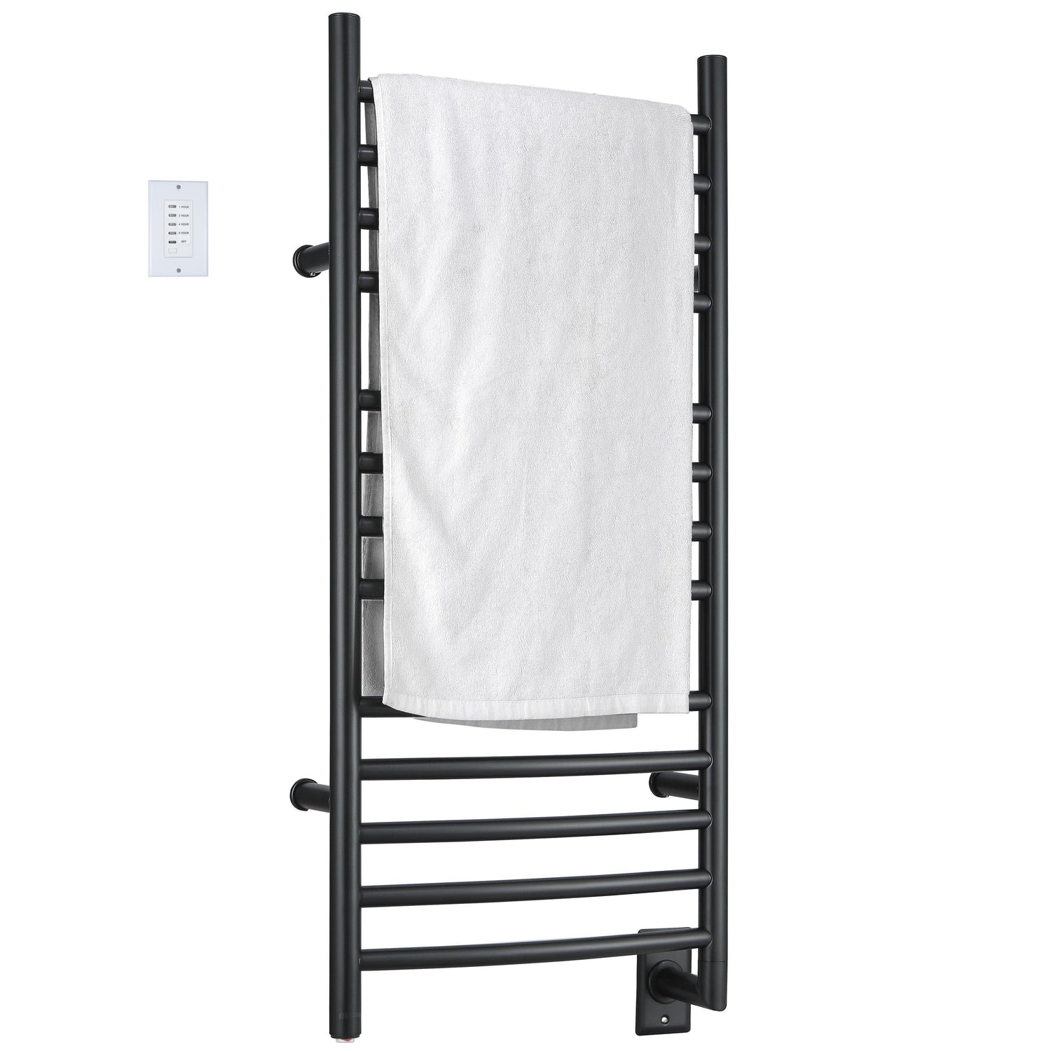 Équipé de notre minuterie de compte à rebours murale facile à utiliser, ce porte-serviette chauffant est préprogrammé pour fonctionner seulement le temps nécessaire. Il est fait à partir d’acier inoxydable de qualité supérieure avec un fini noir mat tendance. Ce porte-serviette chauffant mince à 13 barres possède une conception courbée innovatrice qui sèchera et réchauffera facilement même les serviettes de bain les plus larges et fournit tout ce dont vous avez besoin pour le câbler directement dans le mur.