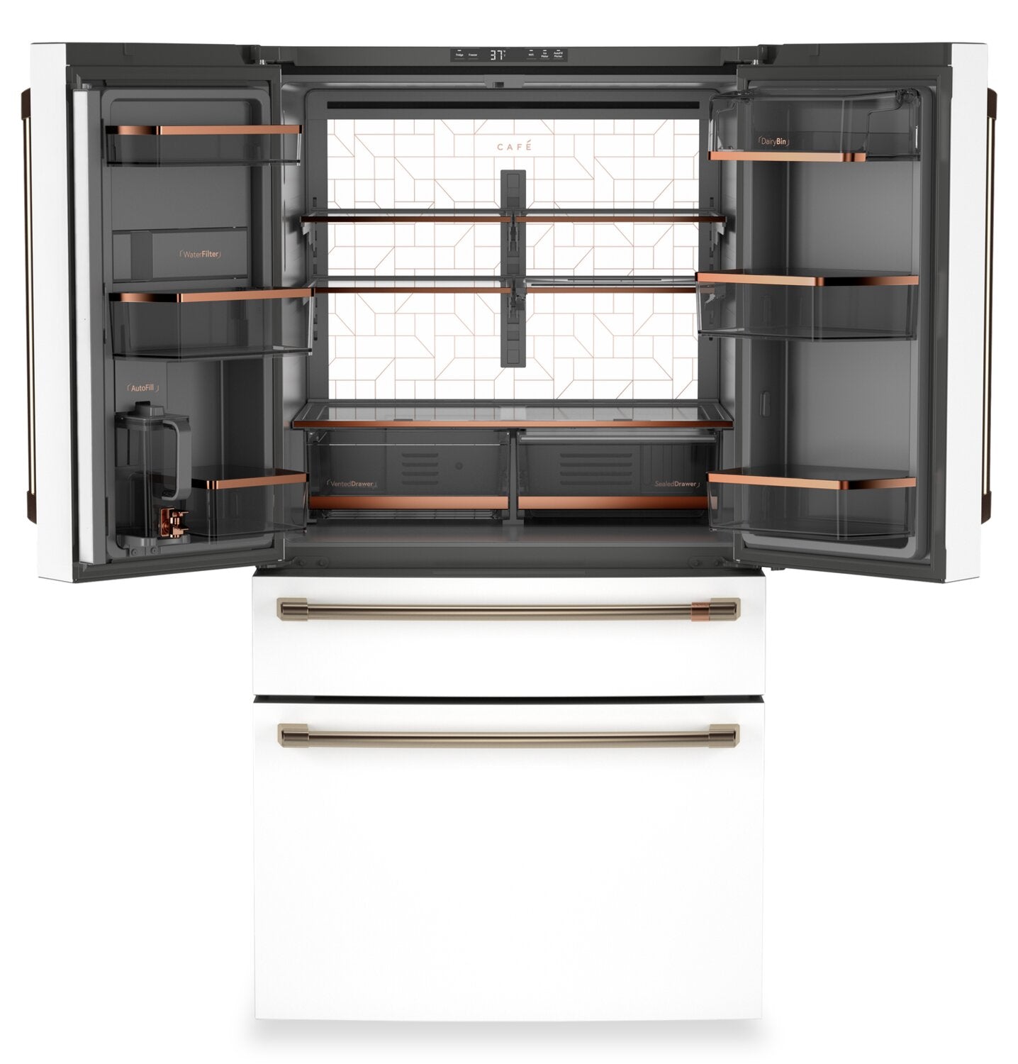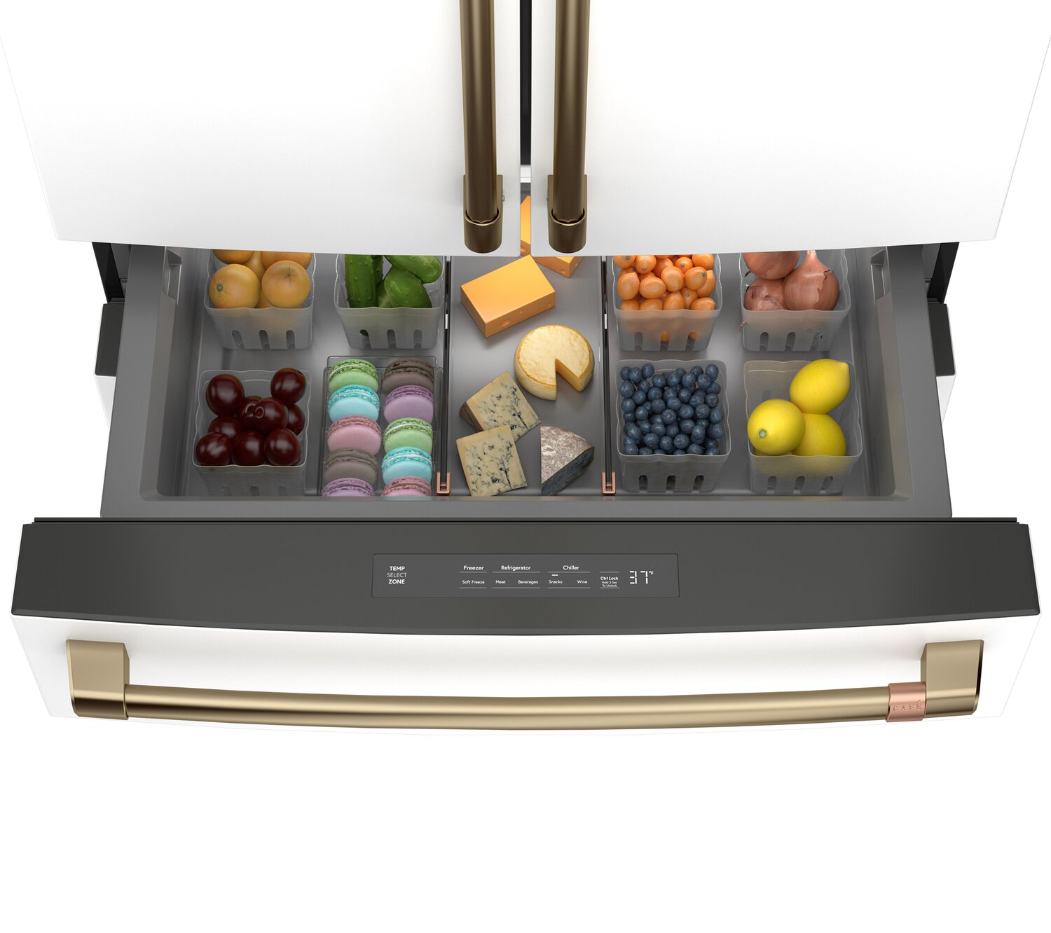 Conception de profondeur comptoir : Pichet à remplissage automatique et à double distribution : Paroi illuminée à DEL : Système de contrôle de l’humidité : Wi-Fi intégré avec application SmartHQMC : Deux évaporateurs TwinChillMC : |