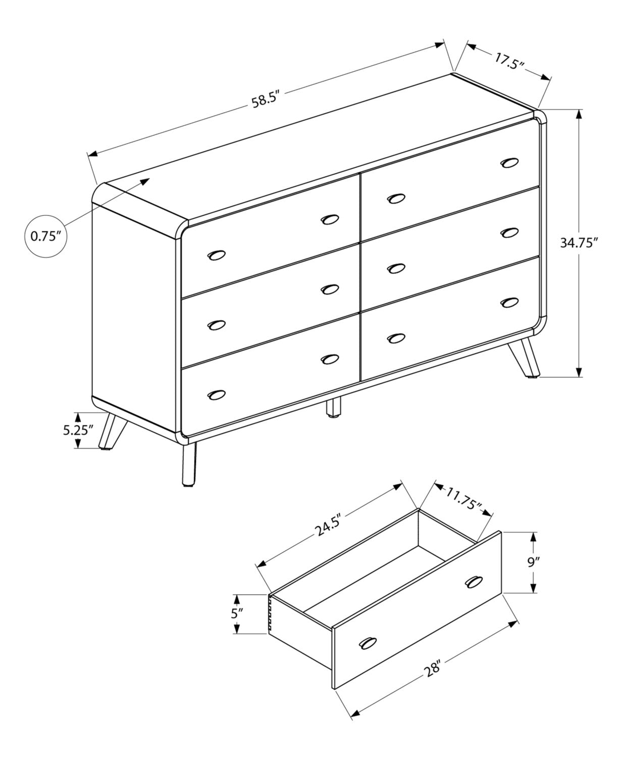 Largeur : 17,50 po (44,5 cm) Hauteur : 34,75 po (88,3 cm) Profondeur : 58,50 po (148,6 cm)