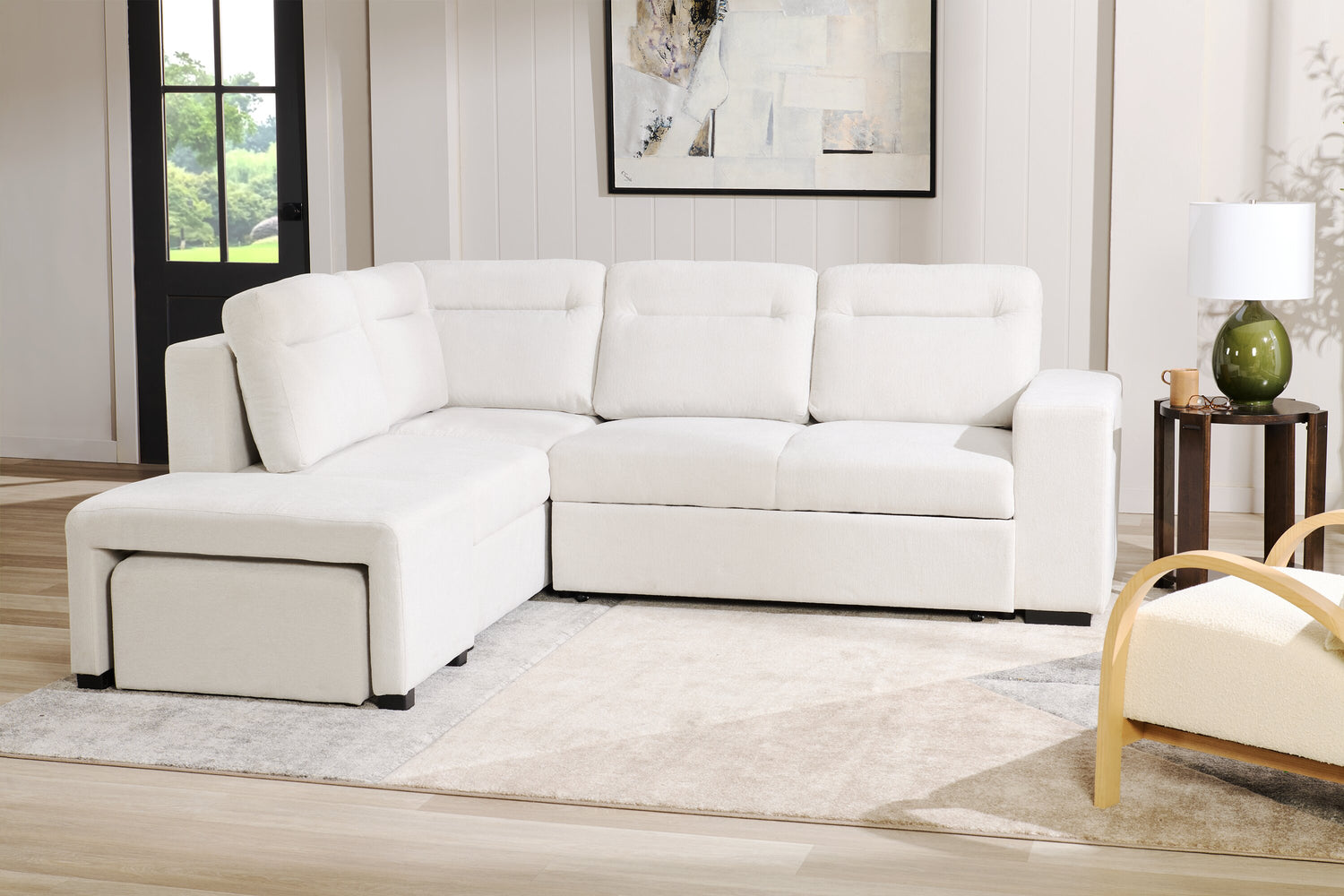 Détails décoratifs | Un tissu blanc éclatant confère une sensation luxueuse à ce meuble et s’agence merveilleusement aux pattes noires du meuble. |