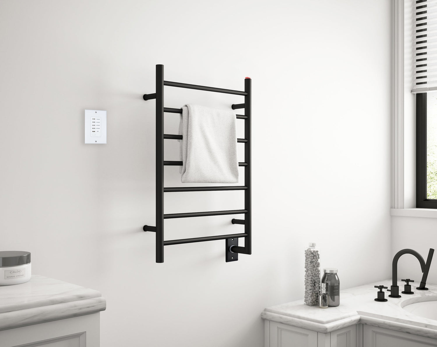 Profitez du luxe rappelant un spa dans votre demeure grâce au porte-serviette chauffant Comfort de Ancona à 7 barres et grille de séchage. Fabriqué de façon experte en acier inoxydable de qualité supérieure au superbe fini noir mat, ce porte-serviette chauffant fournit tout ce dont vous avez besoin pour le câbler directement dans le mur afin que vous n’ayez pas à vous inquiéter d'avoir des câbles ou des fils visibles. Équipé de notre minuterie de compte à rebours murale facile à utiliser, le porte-serviette chauffant Comfort à 7 barres se réchauffe en quelques minutes et est préprogrammé afin de fonctionner le temps dont vous avez besoin pour des économies d'énergie et la tranquillité d’esprit lorsque vous êtes à la maison ou non. Magnifique dans les salles de bain et offrant une foule de possibilités dans la buanderie, la salle d'exercice, le vestiaire d’entrée ou la chambre à coucher, le porte-serviettes chauffant Comfort de Ancona à 7 barres est une façon élégante et écologique de garder vos serviettes et vos vêtements secs, frais et au chaud, peu importe le temps. Vous vous demanderez comment vous avez pu vous en passer.
