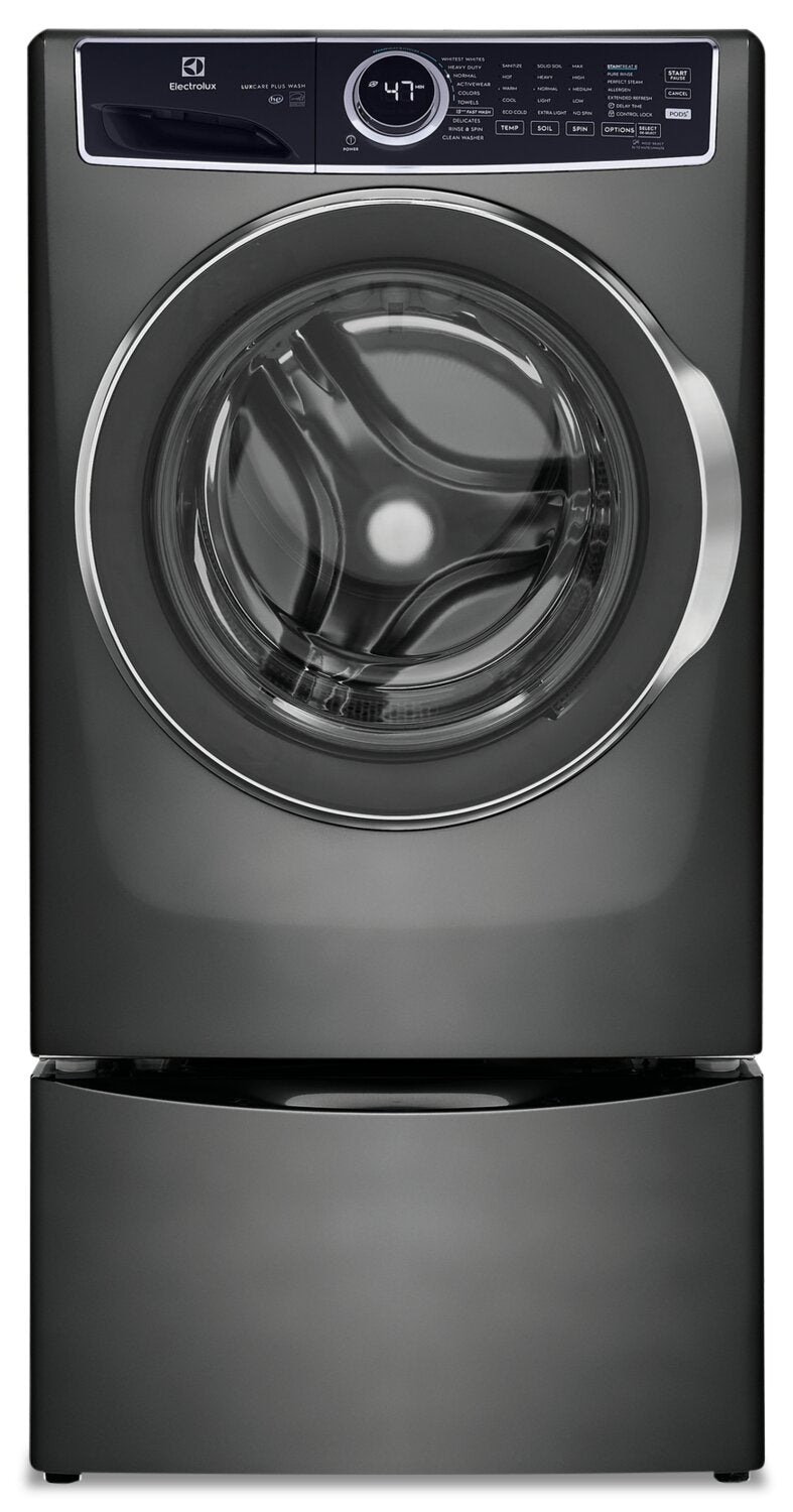 Vendu séparément | Sécheuse électrique (ELFE753CAT), sécheuse à gaz (ELFG7537AT), piédestal de rangement (EPWD257UTT), ensemble de superposition optionnelle (STACKIT7X) |