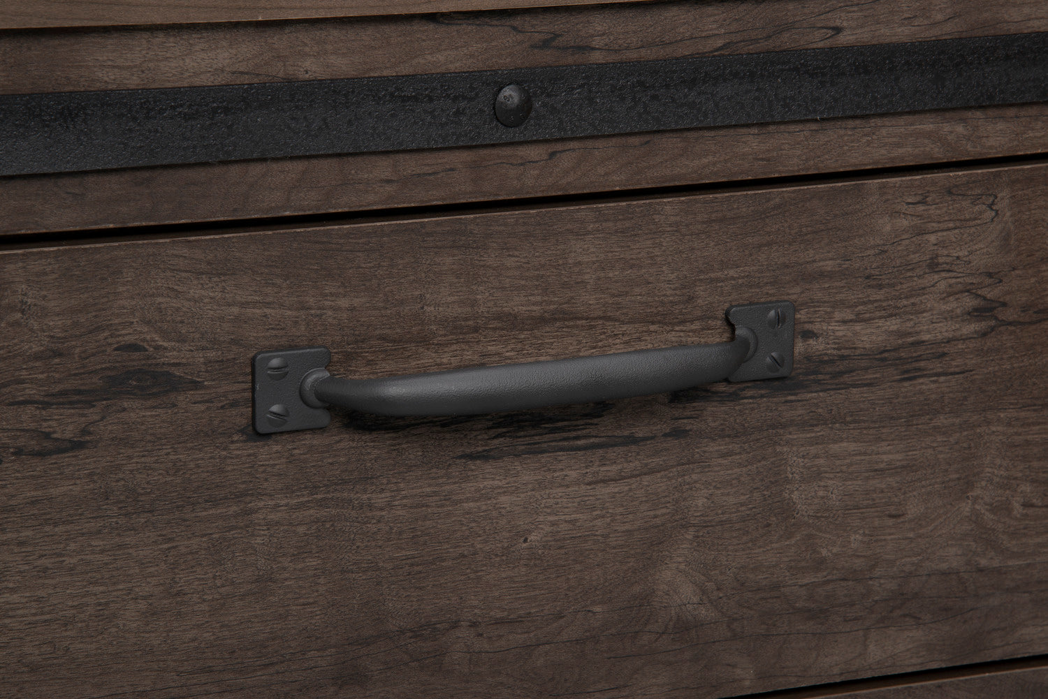 | Quincaillerie | Des poignées rustiques en métal ornent le devant des tiroirs. |