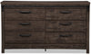 | Détails décoratifs | Une bande en métal foncé ornée de clous décoratifs arrondis borde l'extrémité supérieure de la commode. |
