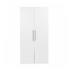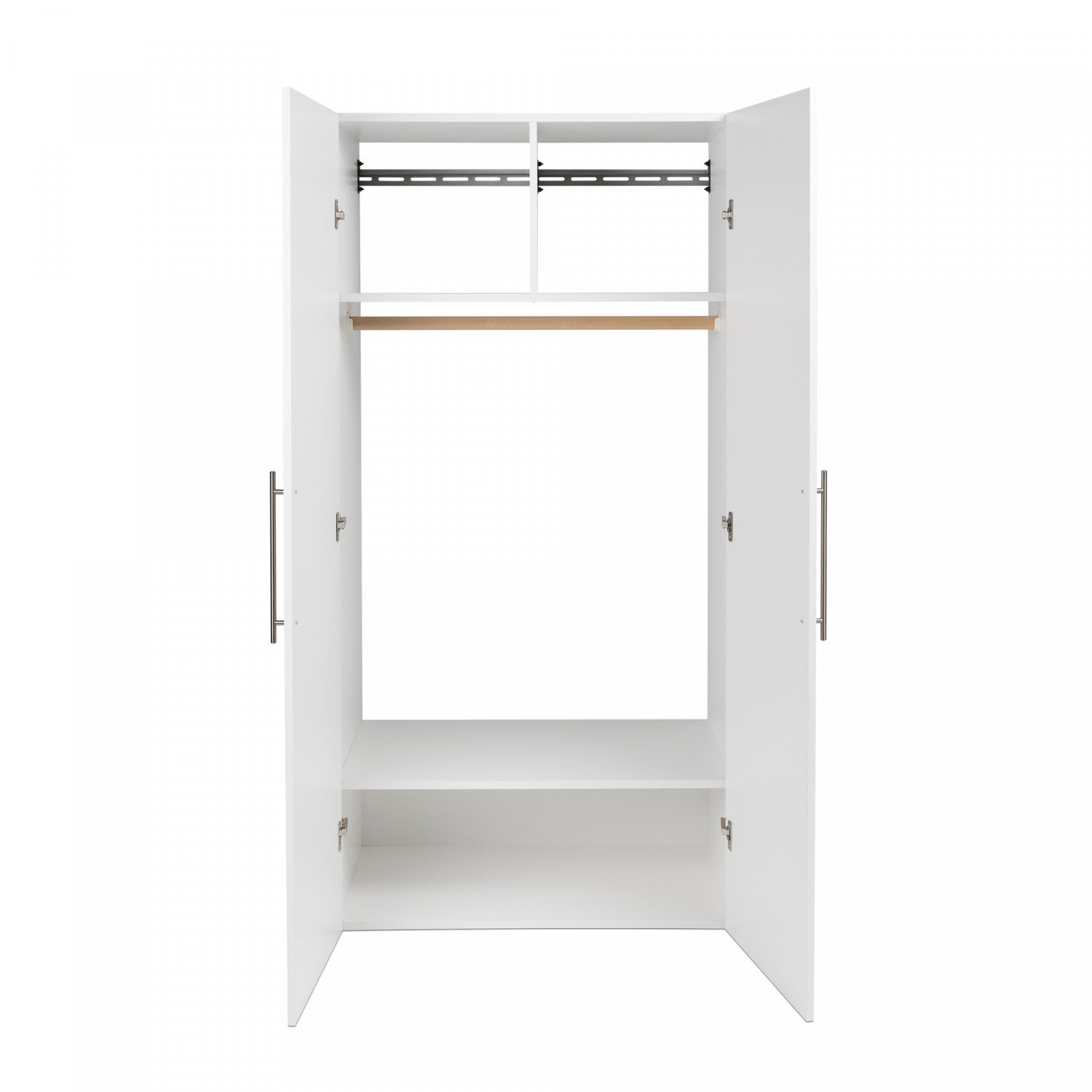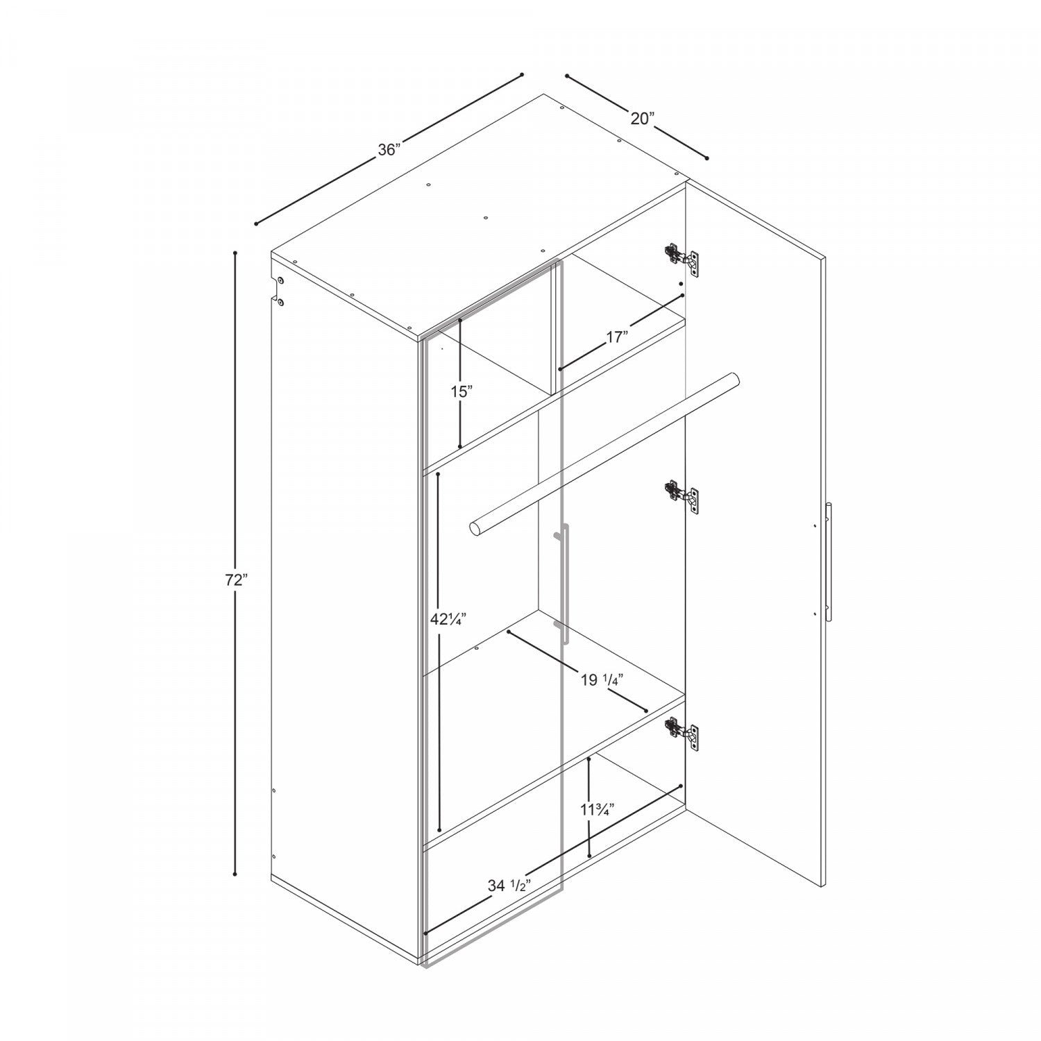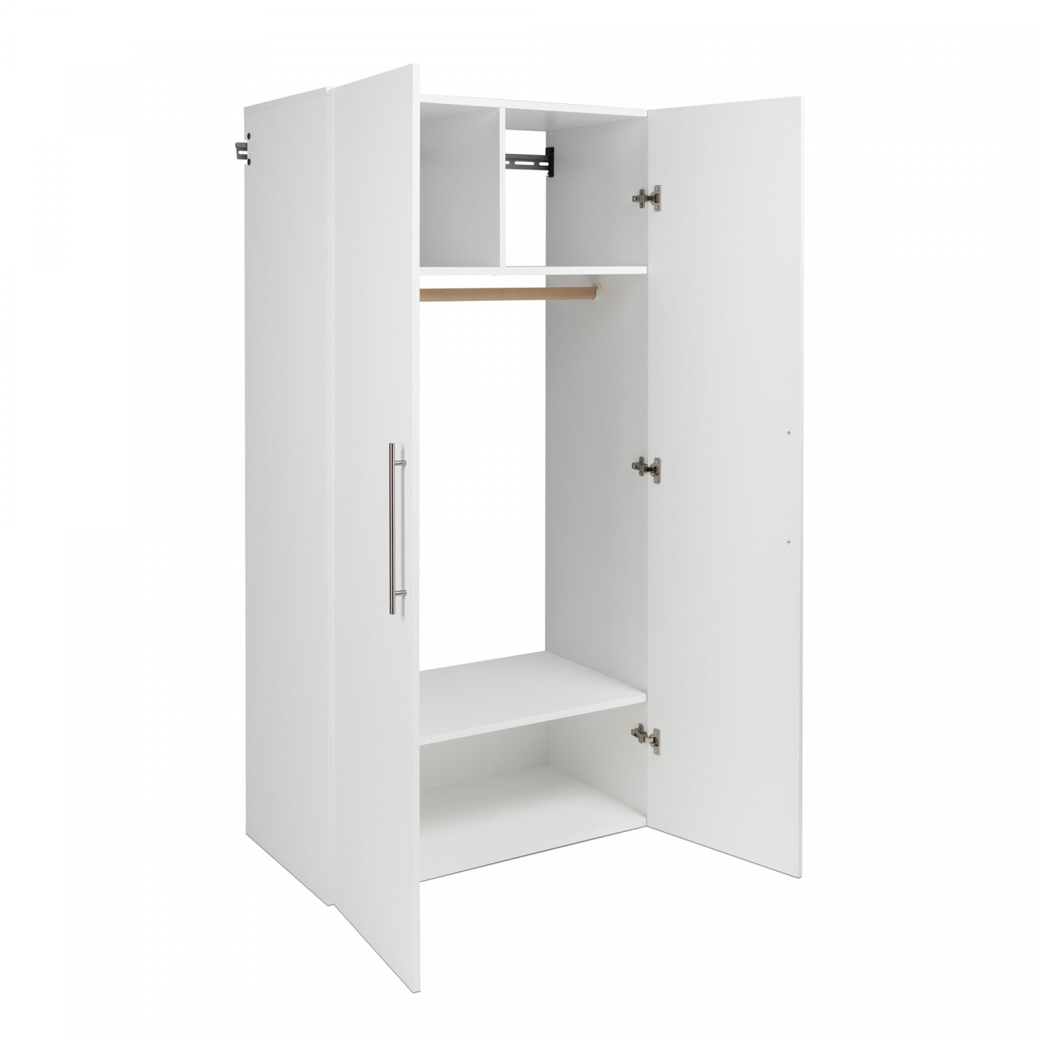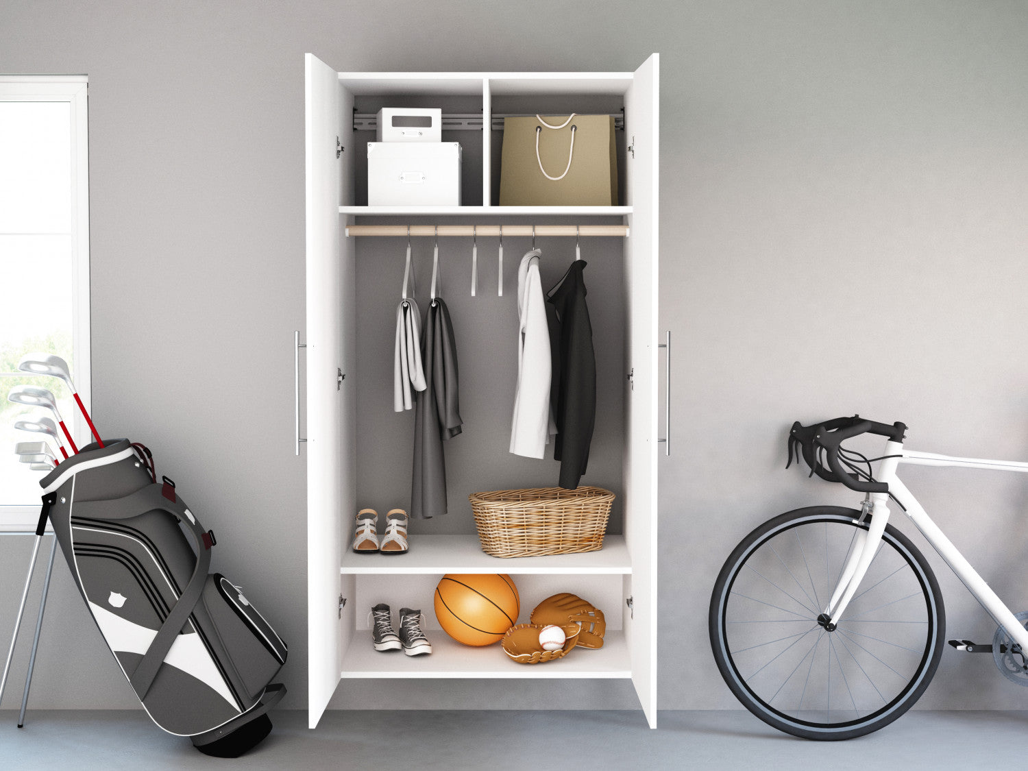 Bienvenue dans un nouveau systeme d’organisation avec l’armoire murale Prepac Hang-Ups. Cette solution de rangement mural est dotee de deux portes sophistiquees aux lignes epurees sur des charnieres reglables, d’une tablette superieure fixe avec un separateur central, d’une tablette inferieure fixe et d’une tringle en bois integree pour plus de flexibilite. Avec une finition en stratifie blanc frais et deux poignees metalliques en nickel satine, cette armoire polyvalente s’integre parfaitement a votre interieur. Utilisez ce vaste compartiment pour suspendre vos vestes sur la large tringle et glisser vos accessoires dans les tablettes fixes. Cette armoire est l’extension parfaite de votre systeme de placard de chambre ou comme penderie dans votre vestibule, entree ou garage. Concue pour etre fixee solidement a un mur robuste grace au systeme de rail metallique et de crochets fourni, vos articles seront proteges de la poussiere tout en permettant un nettoyage facile du sol ou des surfaces situees en dessous. Cette armoire durable est expediee a plat et prete a etre assemblee a la livraison avec un livret d’instructions, des rails de suspension et des boulons de fixation inclus. Cette unite est fabriquee avec des bois composites lamines non toxiques conformes a la norme CARB-2. Dimensions : 20 po P × 36 po L × 72 po H, vous ne manquerez pas d’espace de rangement pour vos vetements.