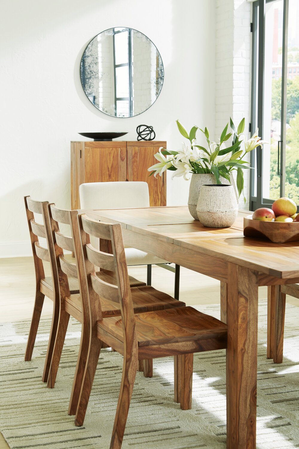 Vendu séparément | Les chaises de salle à manger avec accoudoirs, la table de salle à manger et l’armoire bar Indie assorties. |