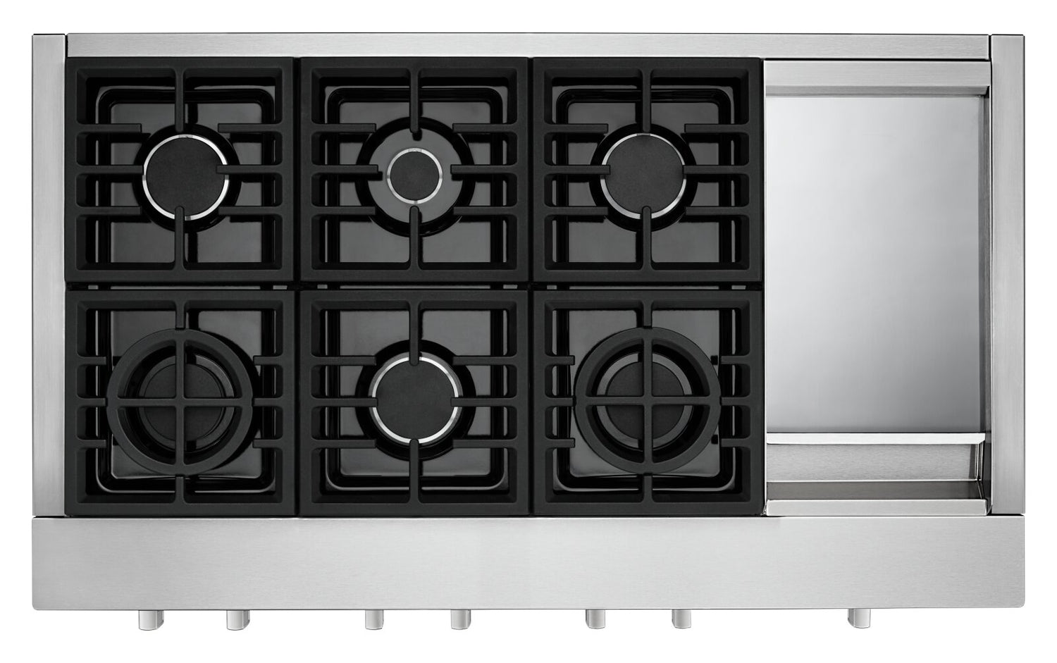 2 brûleurs à flamme double de 20 000 BTU Ultra PowerMC : Brûleur pour faire mijoter et fondre de 5 000 BTU : 3 brûleurs puissants de 15 000 BTU : Grilles convertibles à 3 niveaux : Plaque chauffante électrique chromée : |