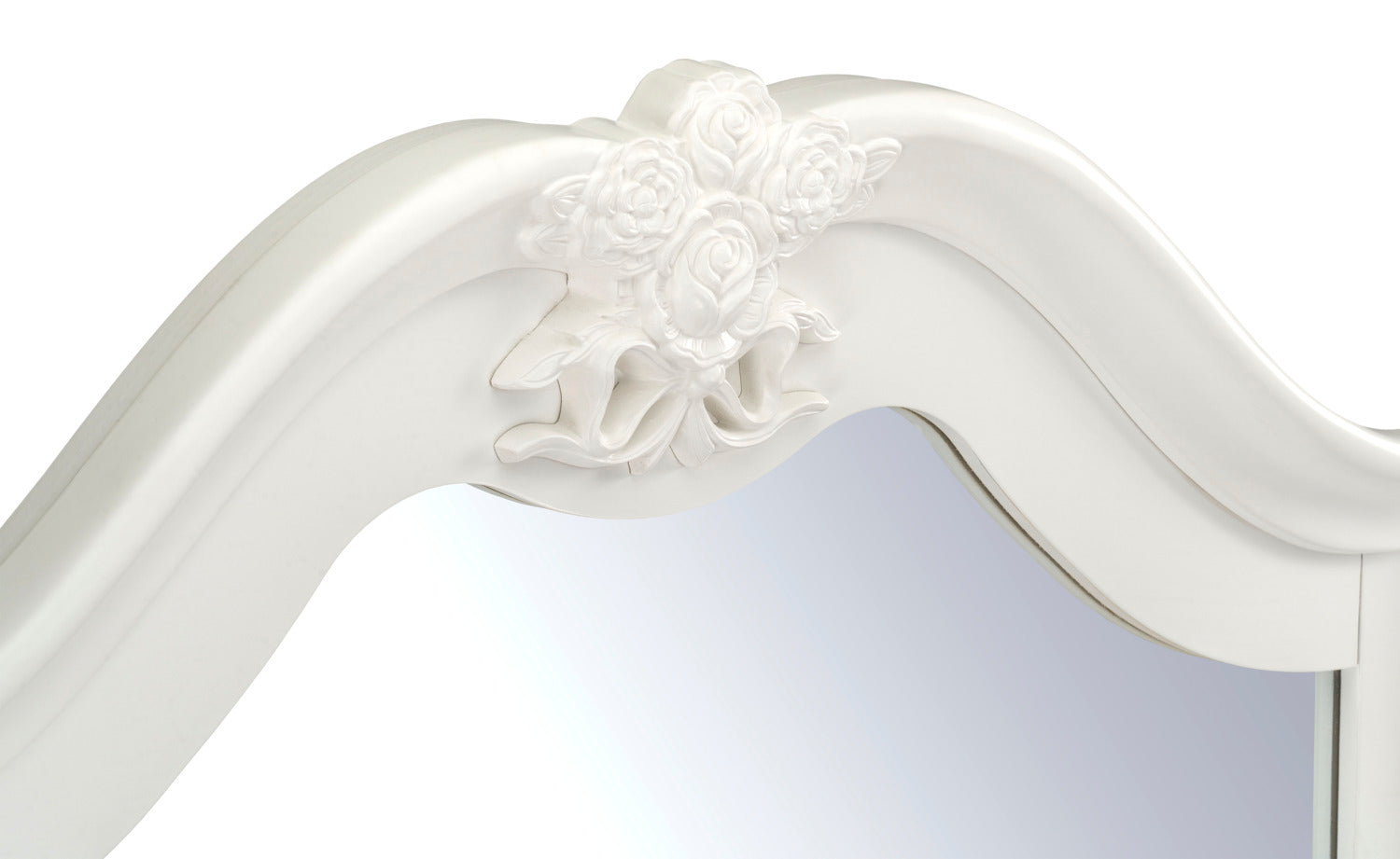 Détails décoratifs | Un large cadre en bois affiche un dessus courbé orné d'un bouquet de roses sculptées en bois. |
