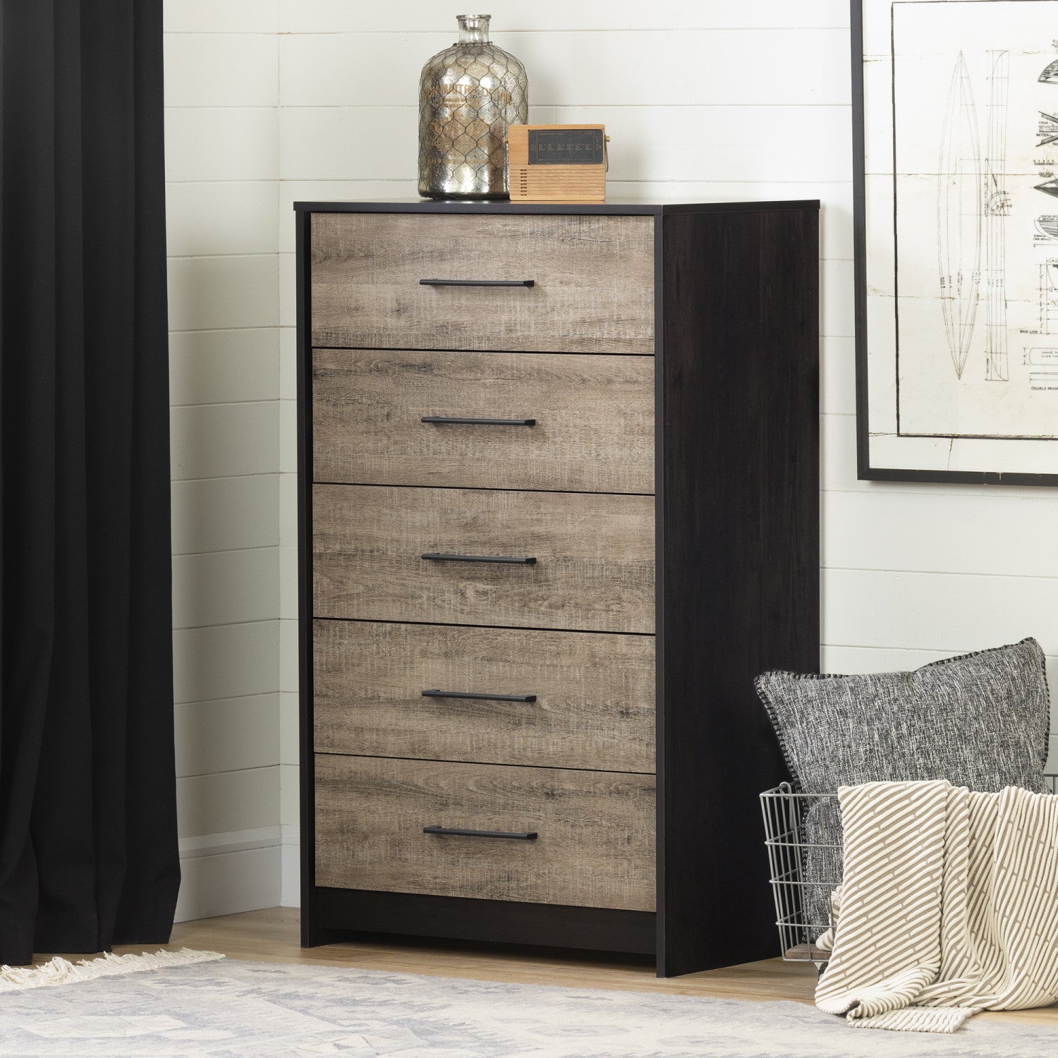 Londen Commode 5 tiroirs Noir antiqué et Chêne vieilli, de Meubles South Shore