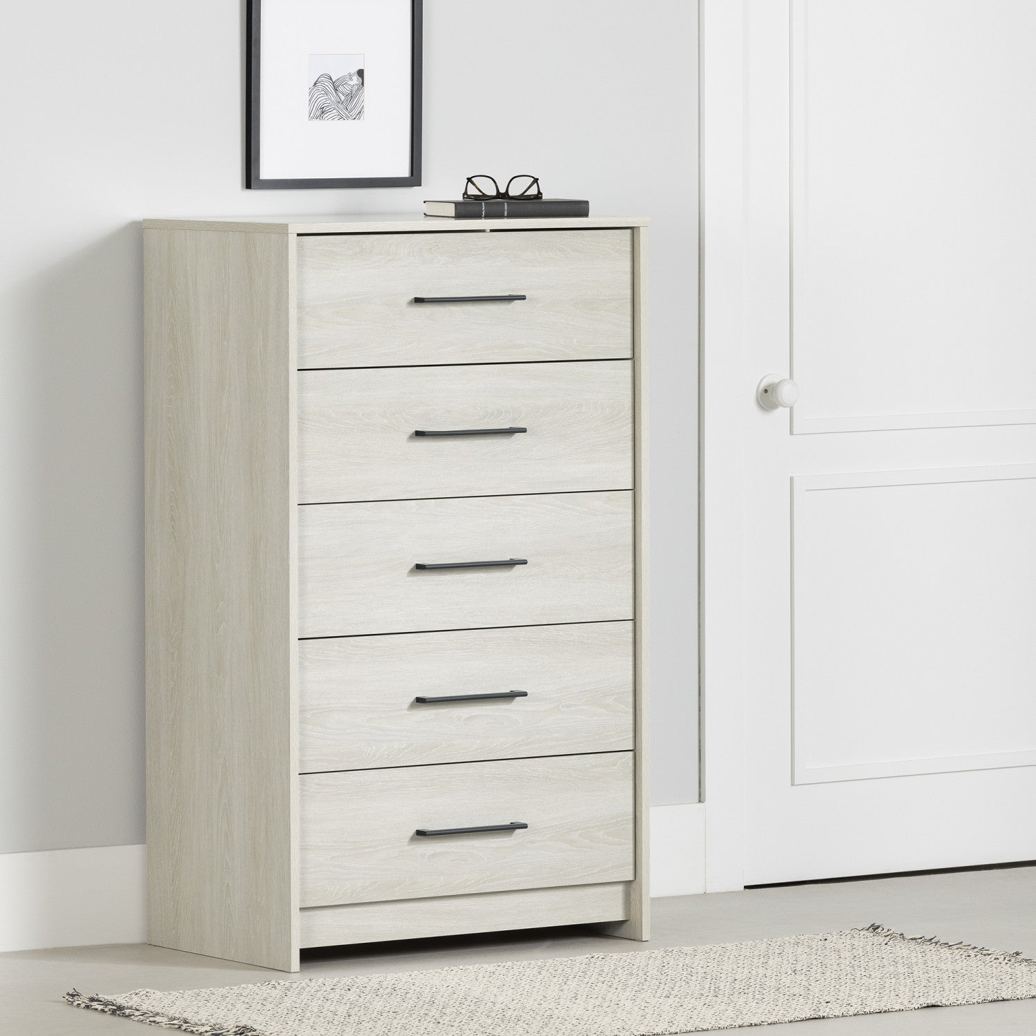 Une commode verticale occupe moins d’espace et est une excellente manière de ranger les vêtements si l’espace est restreint dans votre chambre à coucher. Les cinq tiroirs sont superposés afin que vous puissiez utiliser l’espace mural en hauteur.