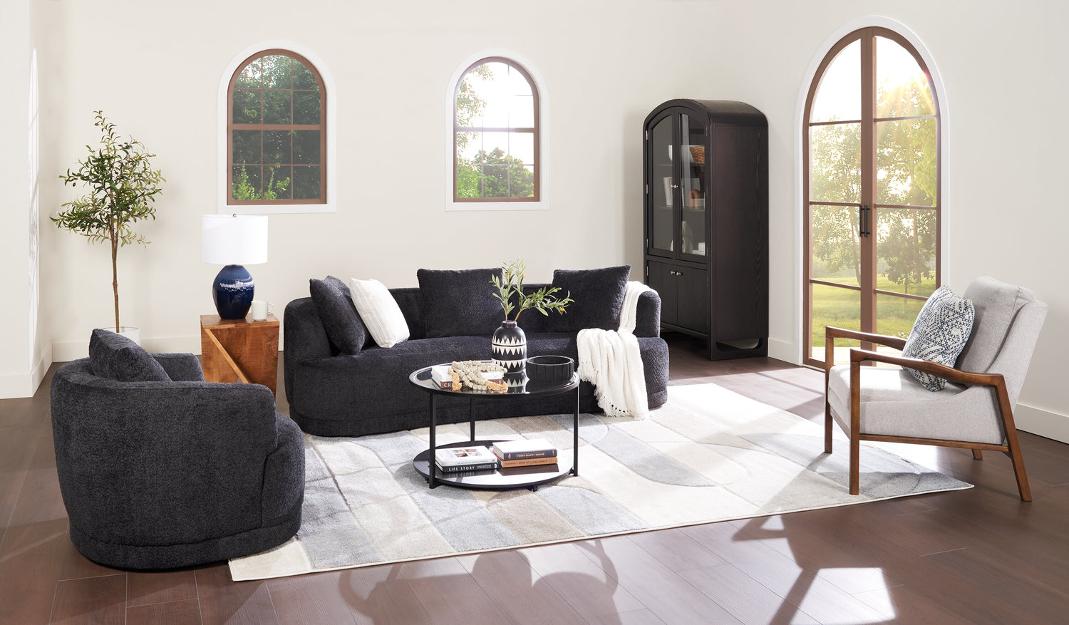 Détails décoratifs | La forme arrondie et le dossier courbé donnent une apparence moderne unique à ce meuble. |