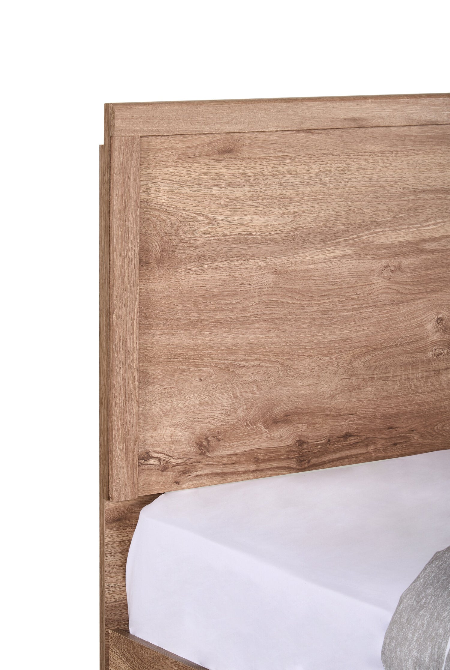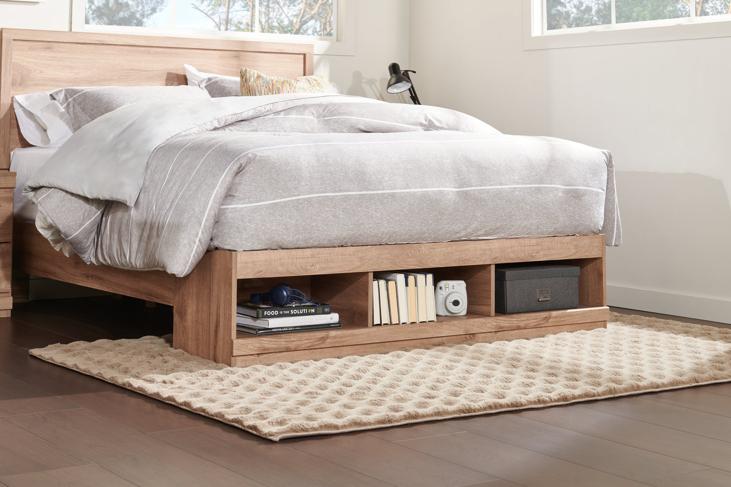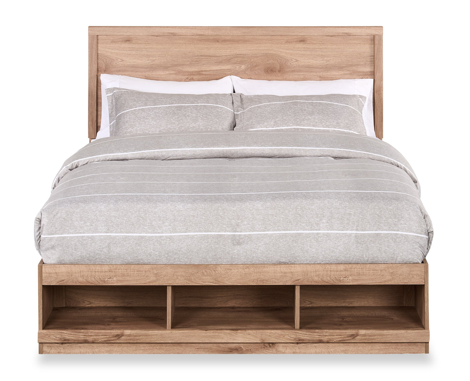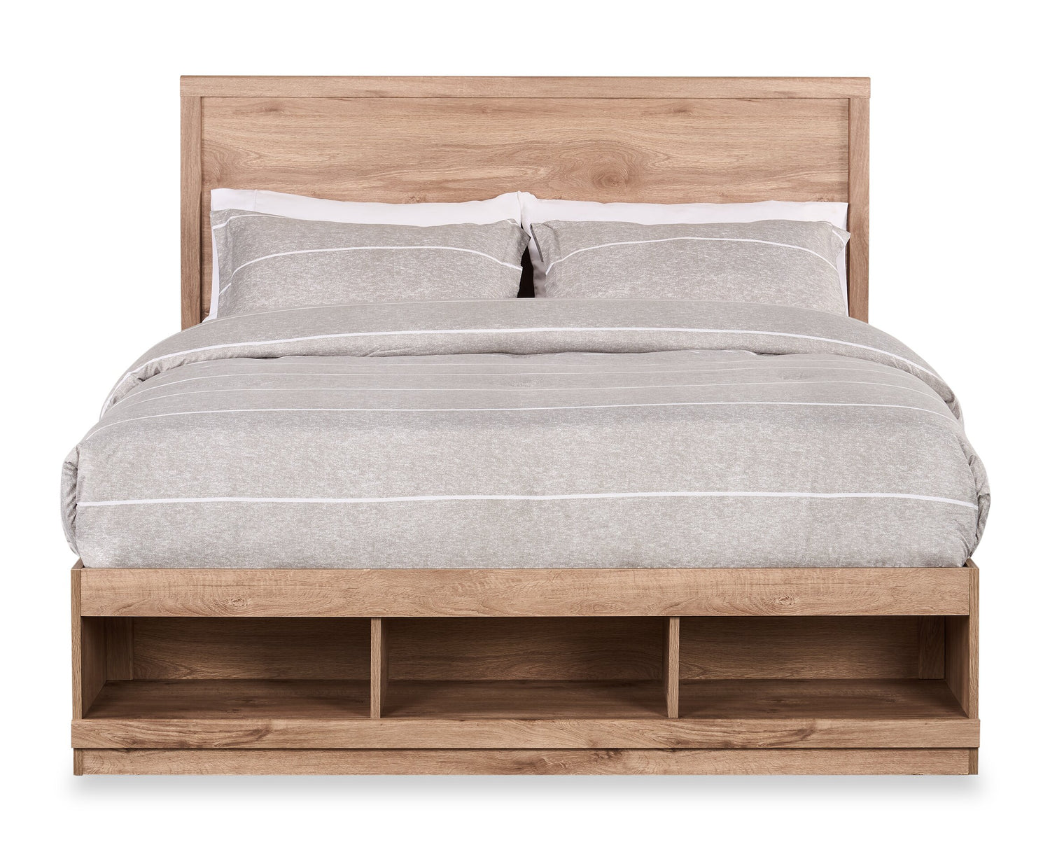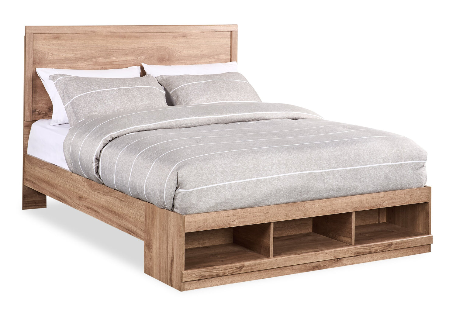 Lit plateforme Oakley fabriqué au Canada avec tête de lit et cadre de rangement, naturel - format grand lit