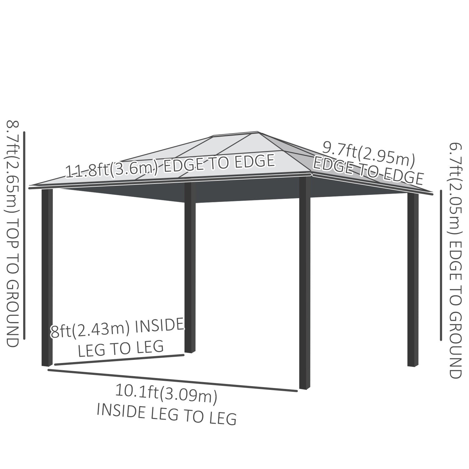Key Features | ● Le kiosque a toit rigide offre 107 pieds carres d'espace de vie exterieur ; ● Le cadre en aluminium robuste offre un excellent support au gazebo; ● Caracteristiques du toit en tole de polycarbonate epais resistant a l'eau et traite contre les rayons UV ; ● Les rideaux et les filets en filet gardent les insectes a l'exterieur et le confort a l'interieur; ● Comprend 8 ancrages qui maintiennent le gazebo stable au sol; ● Le toit ventile elegant dissipe la chaleur estivale et laisse passer la lumiere du soleil; ● Maille et rideau avec un design zippe pour une entree et une sortie faciles ; ● Grandes attaches Velcro sur chaque poteau en acier pour une fixation facile des rideaux; ● Assemblage requis avec tout le materiel necessaire inclus ; |