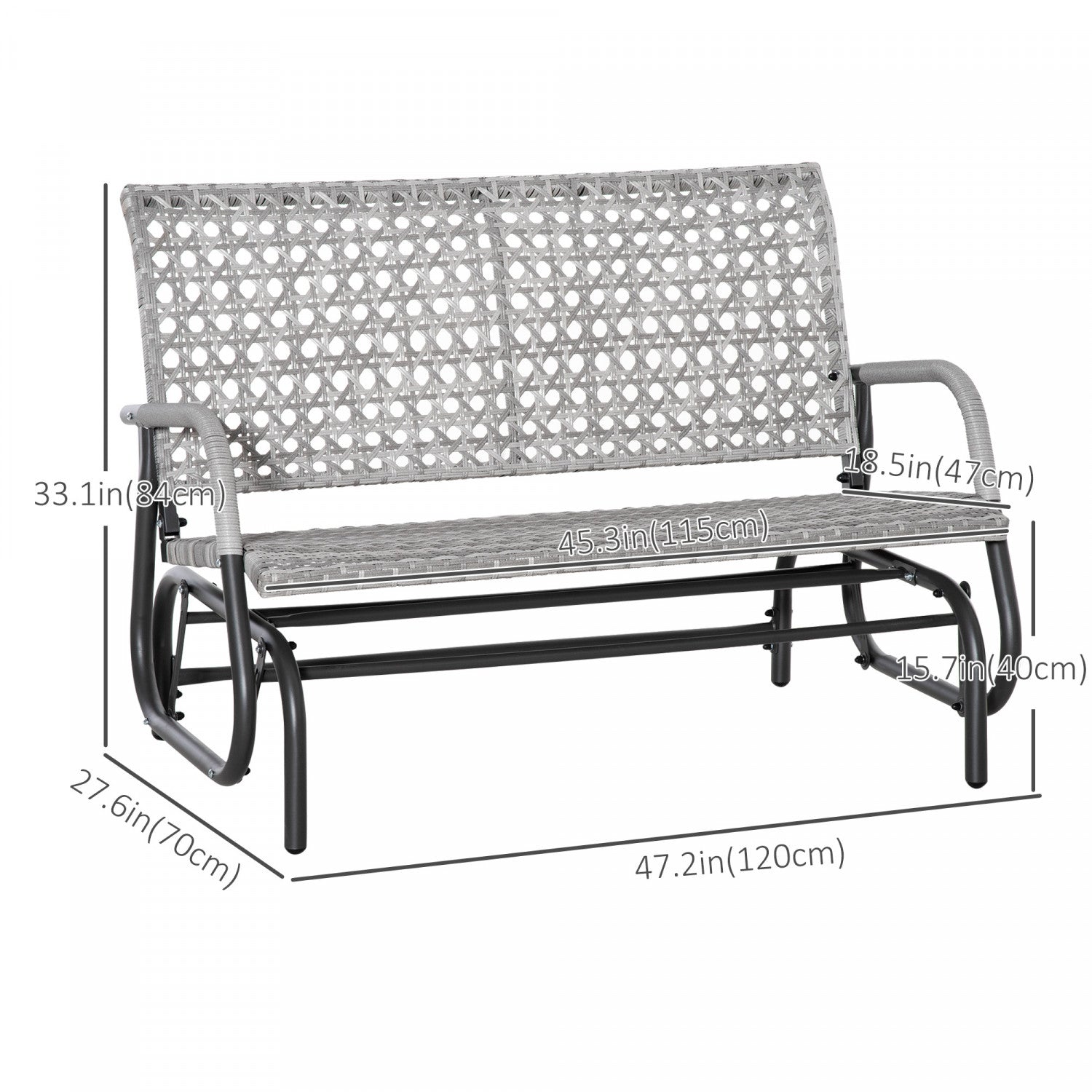 Renseignements supplémentaires | - Couleur : Rotin gris melange, cadre gris ; - Materiau : Acier, rotin PE ; - Dimension totale : 27.5 "L x 47.25 "W x 33 "H ; - Taille du siege : 45,25 "W x 18,5 "D ; - Hauteur du siege : 15,75" ; - Distance de balancement : 9.75" ; - Capacite de poids : 484lbs ; - Etiquette personnalisee : 867-109 ; |