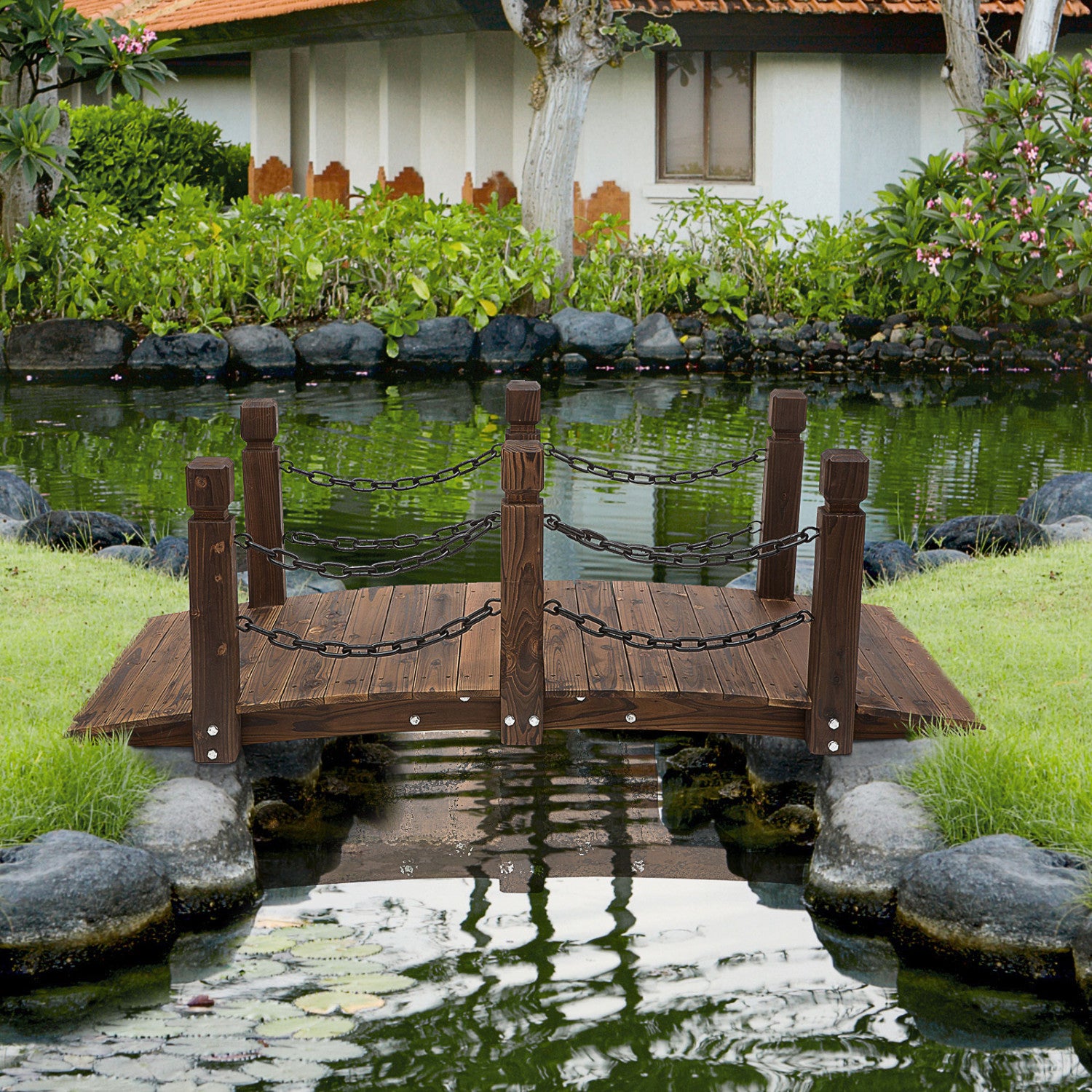Le pont en bois de 5' Outsunny avec rails est parfait pour etre utilise comme decoration paysagere charmante dans un jardin, pres d'un etang ou au-dessus d'un petit ruisseau. Fabrique en bois de sapin massif et teinte pour resister a la pourriture, aux fissures et aux fentes, le pont de jardin est a la fois magnifique et durable.