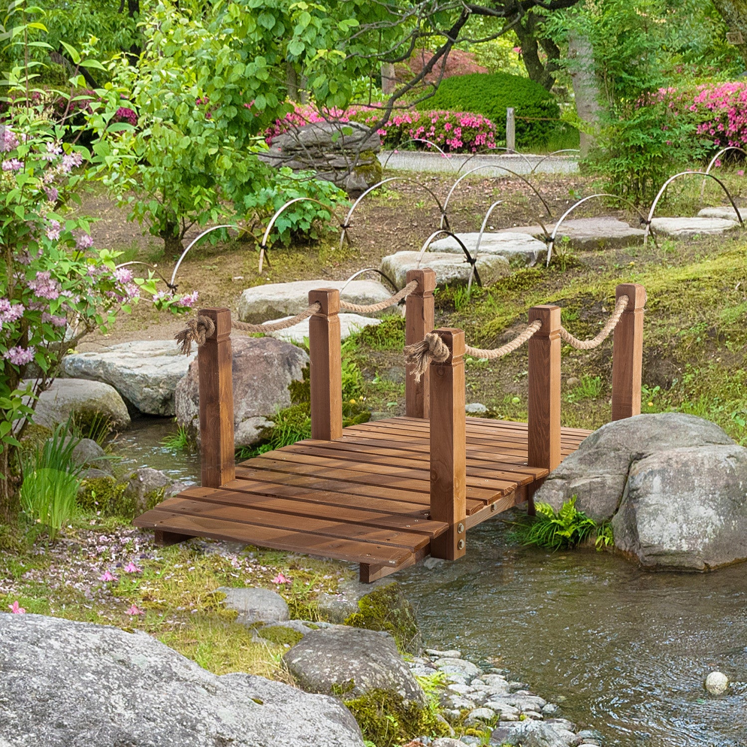 Le pont de jardin en bois avec balustrades d'Outsunny est parfait pour etre utilise comme decoration paysagere charmante dans un jardin d'arriere-cour, pres d'un etang ou au-dessus d'un petit ruisseau. Design elegant rustique de pont est sur d'etre la piece maitresse de votre amenagement paysager et un endroit ou vous pouvez vous arreter et reflechir a la beaute de la nature. Decouvrez cette passerelle d'Outsunny et ajoutez une piece unique a votre beau jardin.