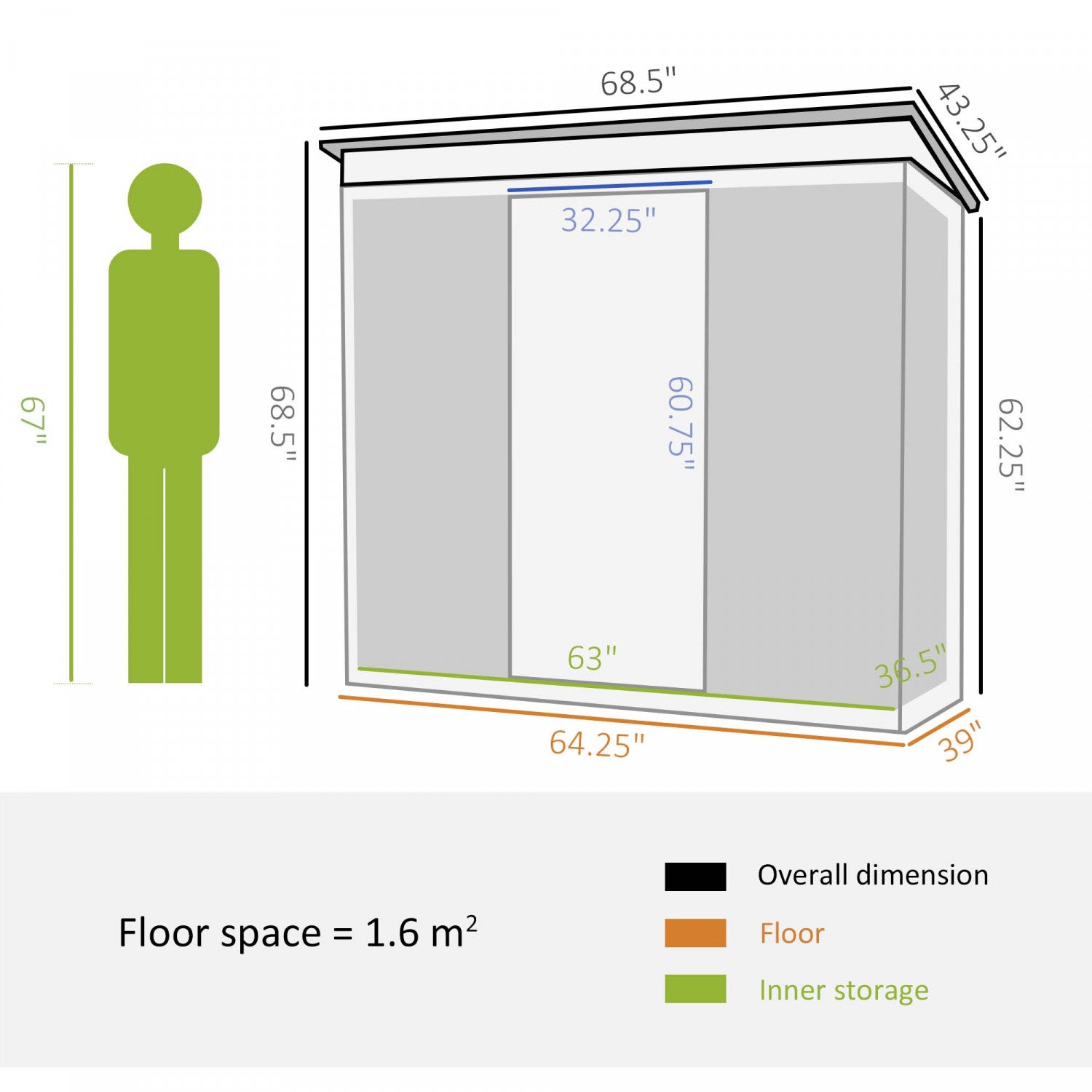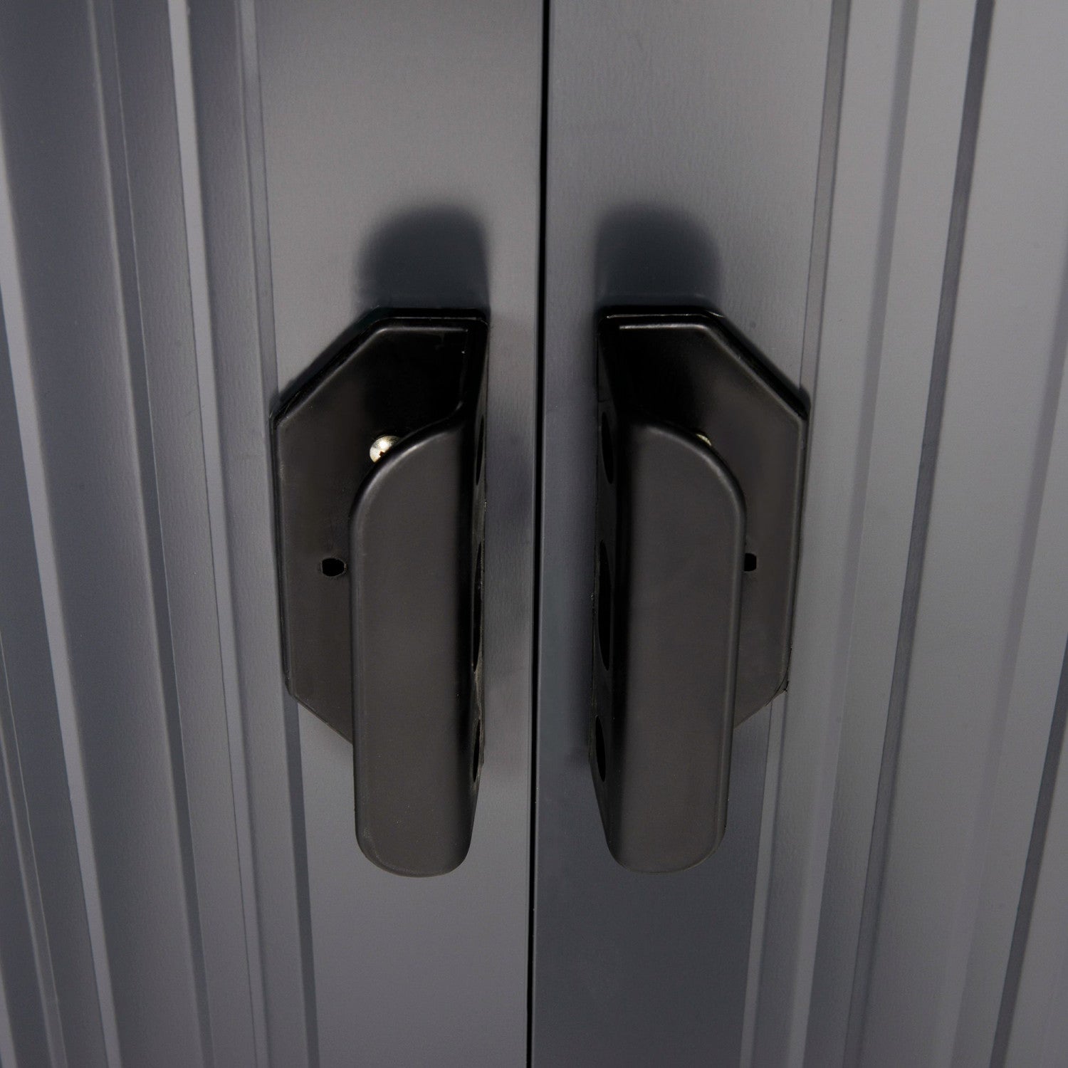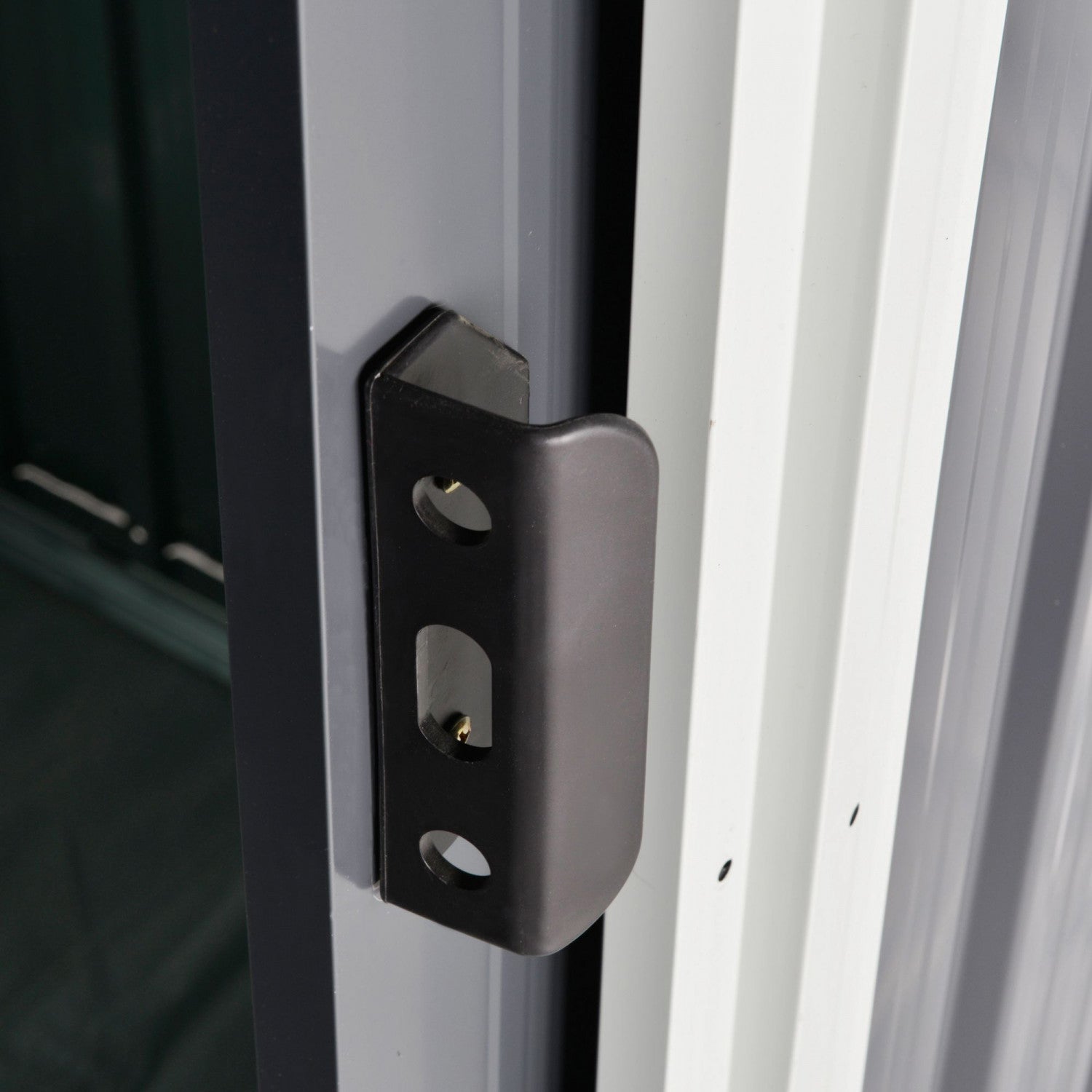 Key Features | ● Beaucoup d'espace de rangement ● Murs et toit en panneaux d'acier resistants a la rouille et a la pluie ● Le toit en pente empeche l'accumulation d'eau ● Double porte coulissante pour un acces facile a l'interieur et a l'exterieur ● La porte est verrouillable pour plus de securite ● Deux fentes d'aeration maintiennent l'interieur frais et aere ● Assemblage requis |