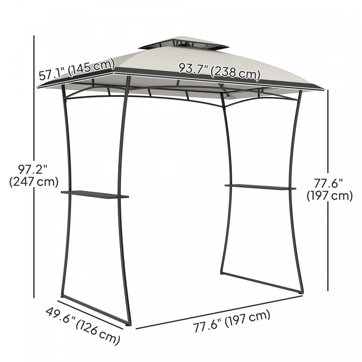 Key Features | - La conception a double dessus ameliore la circulation de l'air, reduisant ainsi l'accumulation de fumee pendant les barbecues ; - Les trous de fuite d'eau empechent l'accumulation de pluie, gardant les rassemblements au sec ; - Les etageres laterales offrent un rangement pratique pour les condiments et les ustensiles ; - L'auvent comprend un crochet pour accrocher facilement une lampe ; - Le cadre en acier enduit de poudre resiste a la rouille, a la deformation et a l'usure ; - Piquets de terre et vis d'expansion inclus pour un assemblage stable ; |