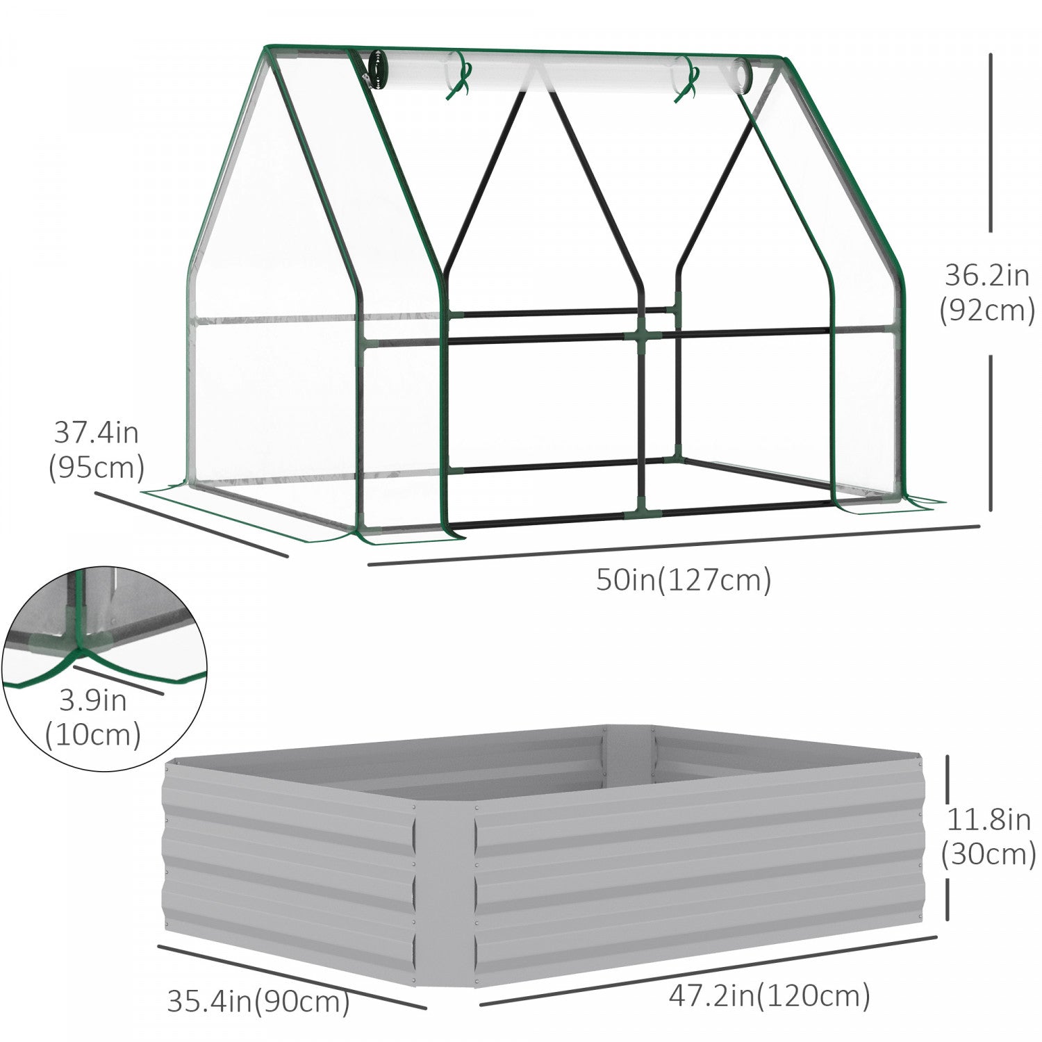 Outsunny Lit De Jardin Sureleve Galvanise De 4' X 3' Avec Mini Housse De Serre En Plastique, Jardiniere D'exterieur En Metal Avec 2 Fenetres Enroulables Pour Cultiver Fleurs, Fruits, Transparent