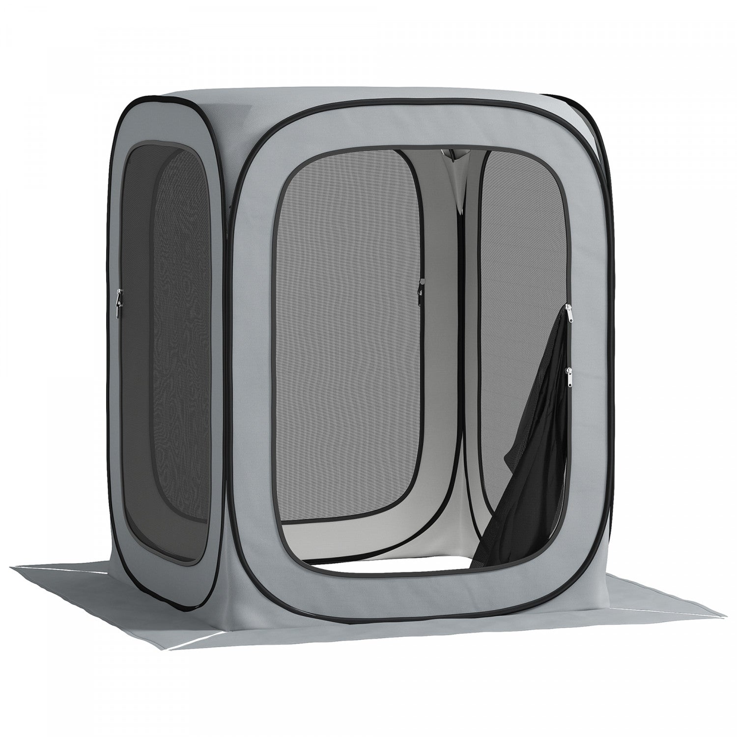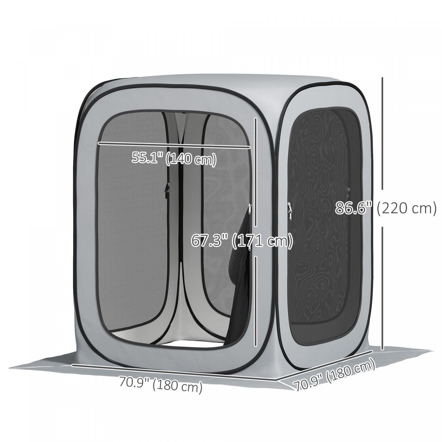 Renseignements supplémentaires | - Couleur : gris clair ; - Materiaux : tissu Oxford, fil d'acier, maille ; - Dimensions globales : 70,9" L x 70,9" l x 86,6" H (180 x 180 x 220 cm) ; - Dimensions plie : 27,6" L x 27,6" l x 2,8" H (70 x 70 x 7 cm) ; - Hauteur de la porte : 70,9" H (180 cm) ; - Taille de la fenetre : 55,1" L x 67,3" H (140 x 171 cm) ; - Indice de coupe-vent : 10,6-20,8 km/h (avec piquets de sol et haubans) ; - Etiquette de l'article : 84C-648V00LG ; |