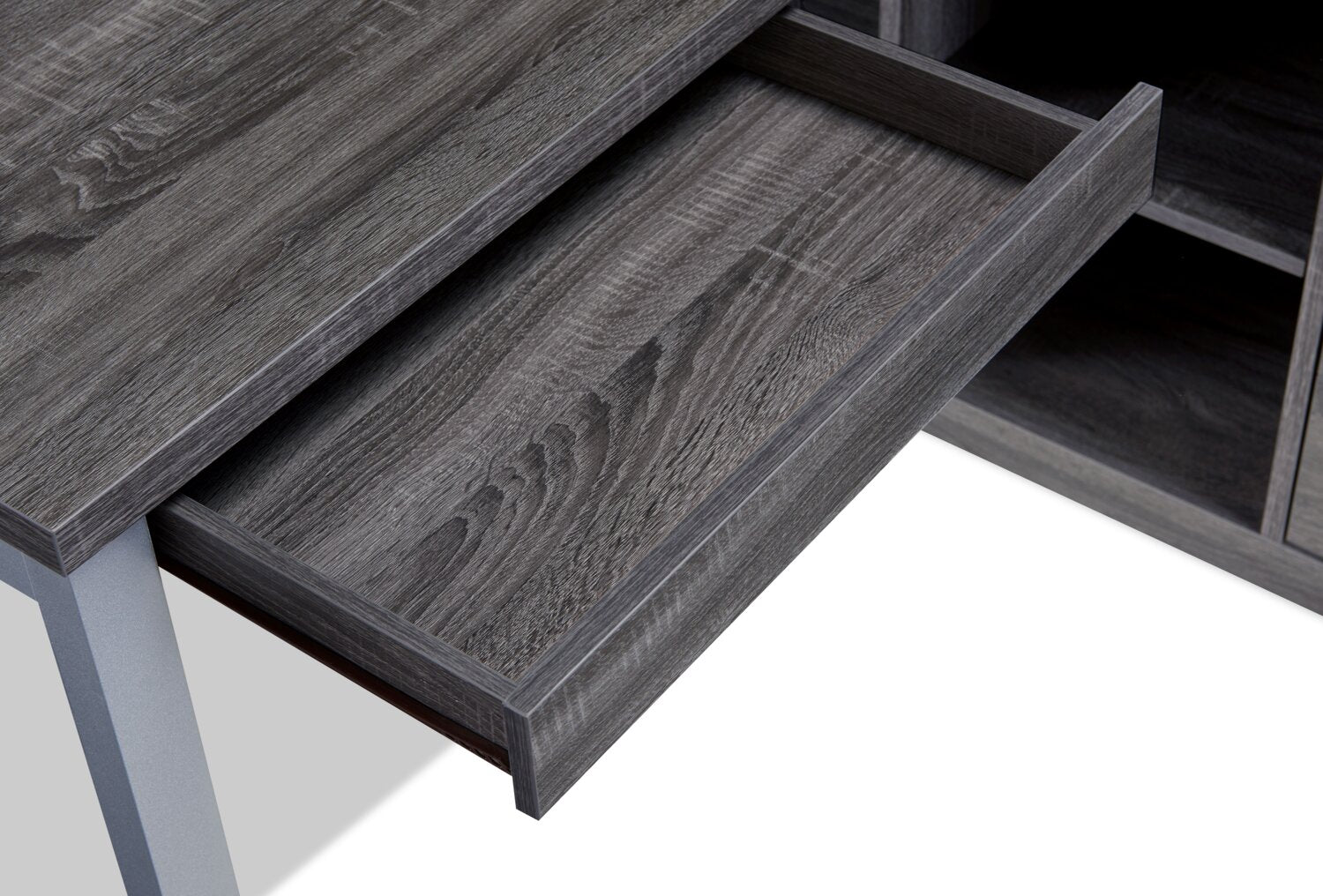 Détails décoratifs | Les poignées de couleur argentée sur les tiroirs s'assortissent aux pattes pour conférer une touche industrielle à ce meuble. |