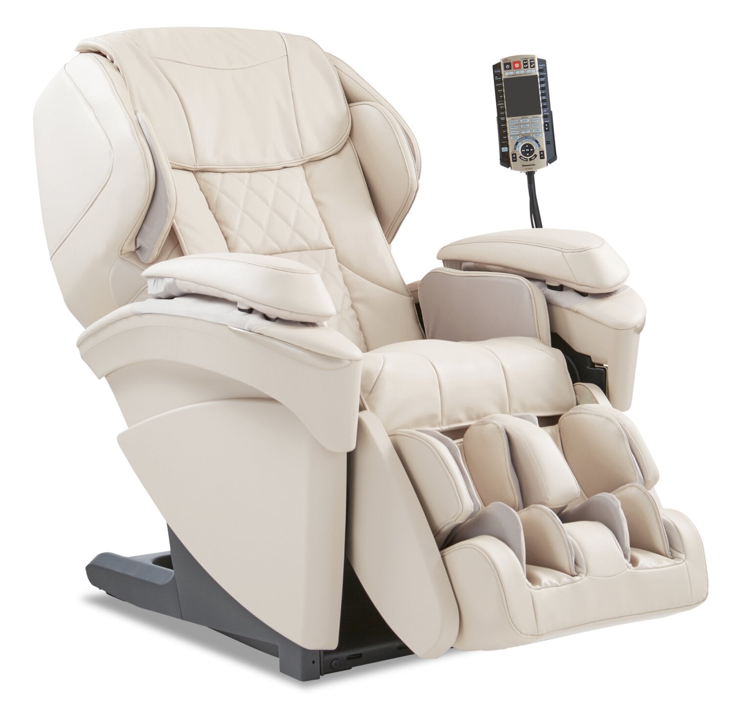 | Pieds du meuble | Une base en plastique noir procure un robuste soutien à ce fauteuil de massage et abrite sa source d'électricité. |