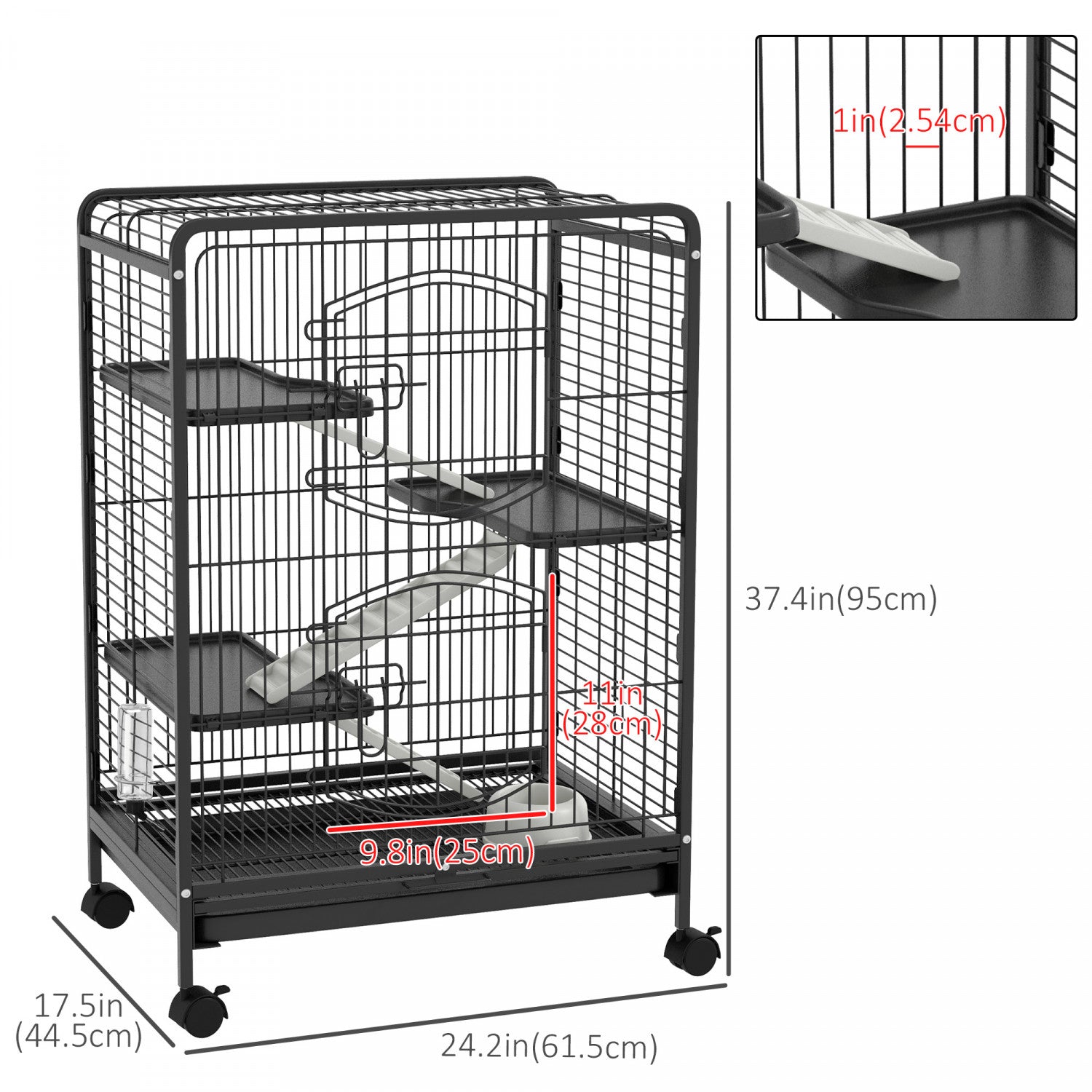 | Key Features | ● Ideal pour une variete de petits animaux, notamment le lapin, le furet, le chinchilla et d'autres petits animaux de taille similaire; ● Plat de nourriture et bouteille d'eau inclus pour les besoins quotidiens; ● Avec plusieurs portes pour un acces facile a l'interieur de l'enclos pour petits animaux; ● Comprend un plateau inferieur pour contenir la litiere, amovible pour un nettoyage facile; ● 3 rampes, 3 plateformes sont incluses; ● L'espacement des barreaux assure une bonne ventilation; ● Roues de roulement attachees, faciles a transporter et a verrouiller en place; ● Assemblage simple requis; |