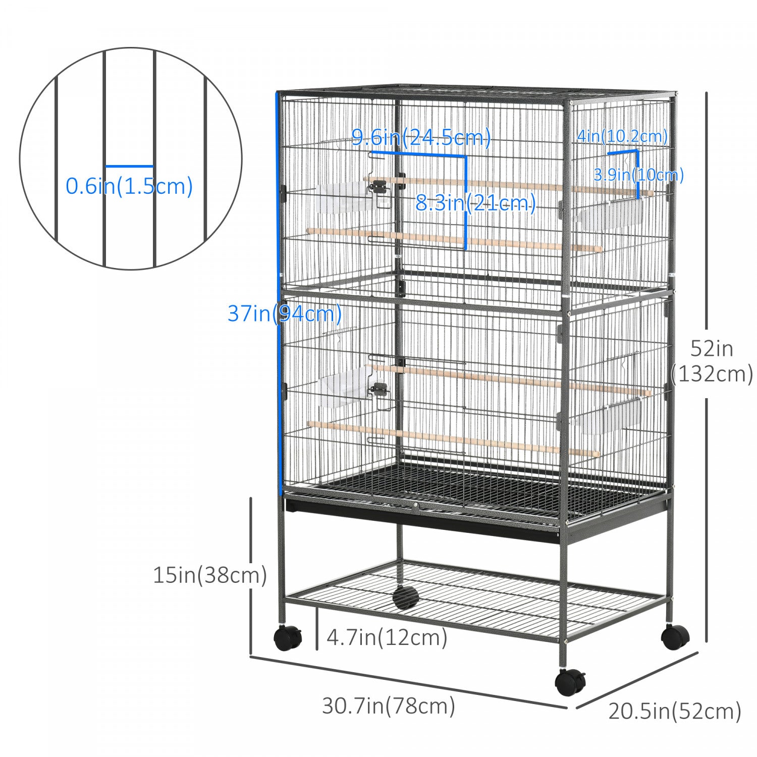 Pawhut Grande Cage A Oiseaux En Acier De 52'' Avec Support Roulant, Etagere De Rangement, Perchoir En Bois, Contenant A Nourriture, Gris Fonce