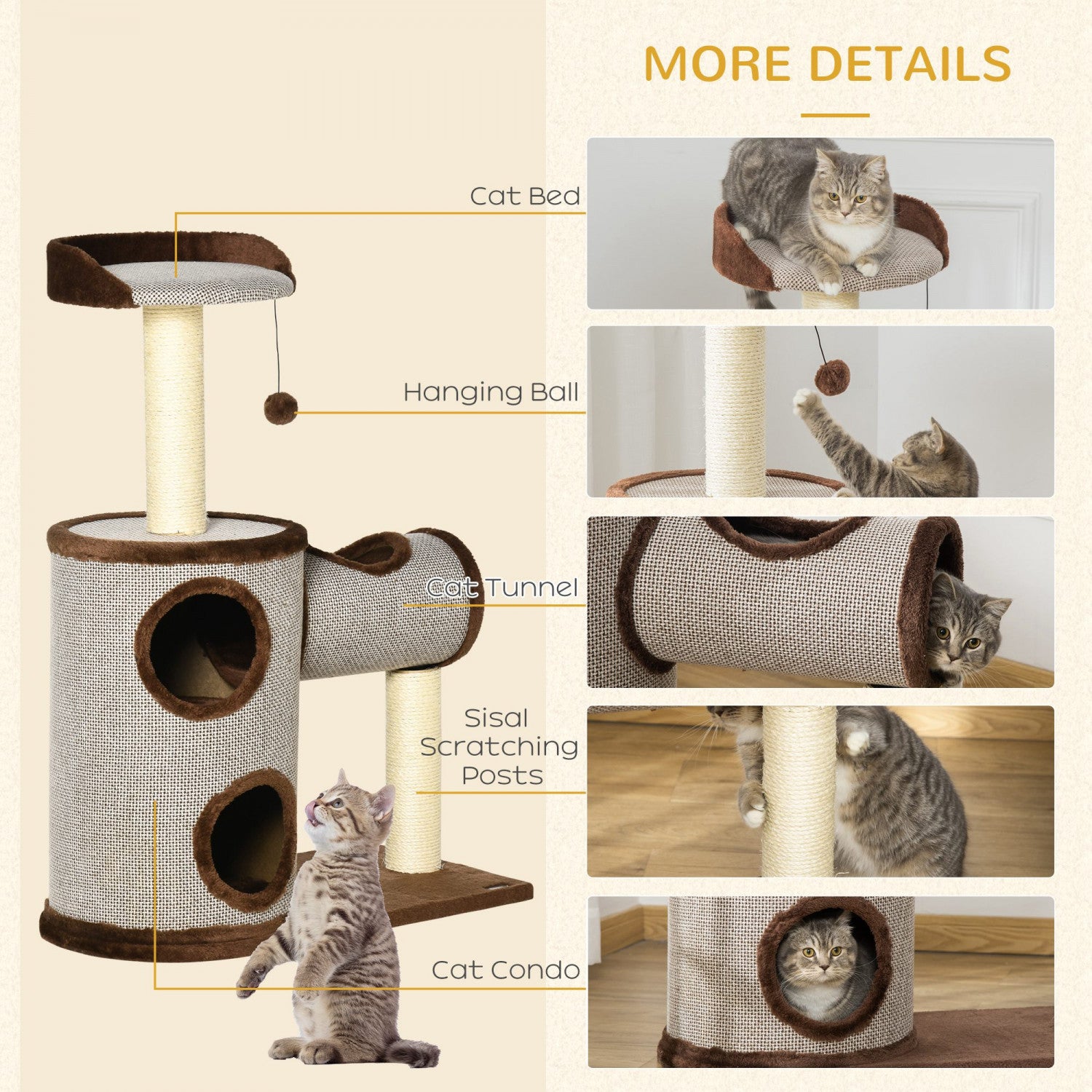 Pawhut Arbre A Chat D'interieur, Centre D'activites D'escalade, Meubles Pour Chaton Avec Maison Pour Chat, Lit, Griffoir, Jouet Suspendu, Marron