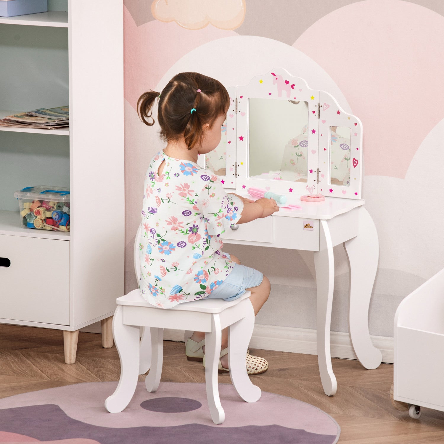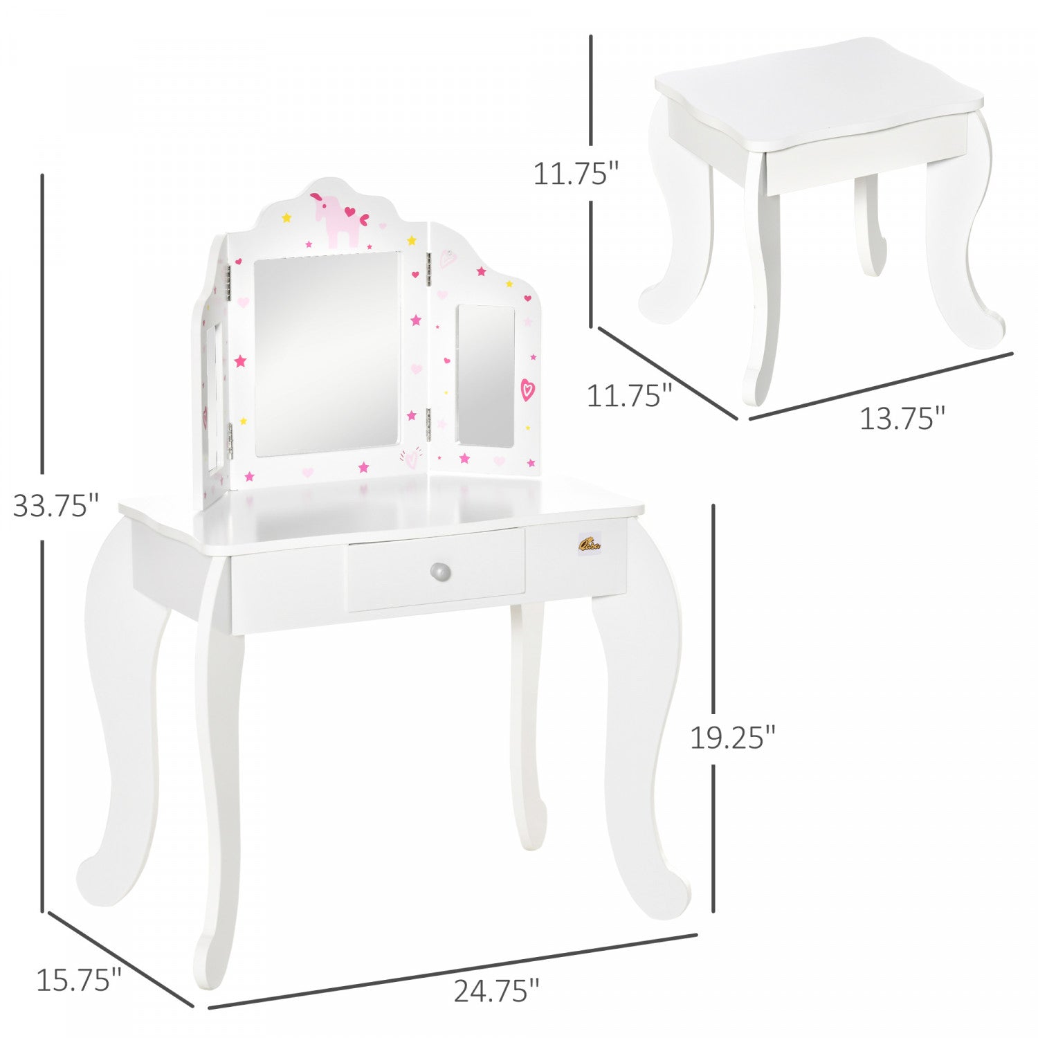 Key Features | ● L'ensemble de 2 pieces comprend une coiffeuse et un tabouret assorti; ● De beaux motifs d'etoiles et de coeurs, satisfont les reves de princesse de chaque petite fille; ● Convient pour chambre d'enfant, salle de jeux et garderie; ● Cadre en bois MDF de haute qualite avec coin arrondi; ● 3 miroirs transparents visibles repondent aux besoins quotidiens des filles en matiere de maquillage et sont fabriques en acrylique qui ne se cassent pas facilement; ● Deux miroirs sur le cote peuvent etre tournes, ce qui est pratique pour regarder sous plusieurs angles; ● Comprend un tiroir pour ranger maquillage, epingle a cheveux, boucle a cheveux, etc.; ● Assemblage requis; |