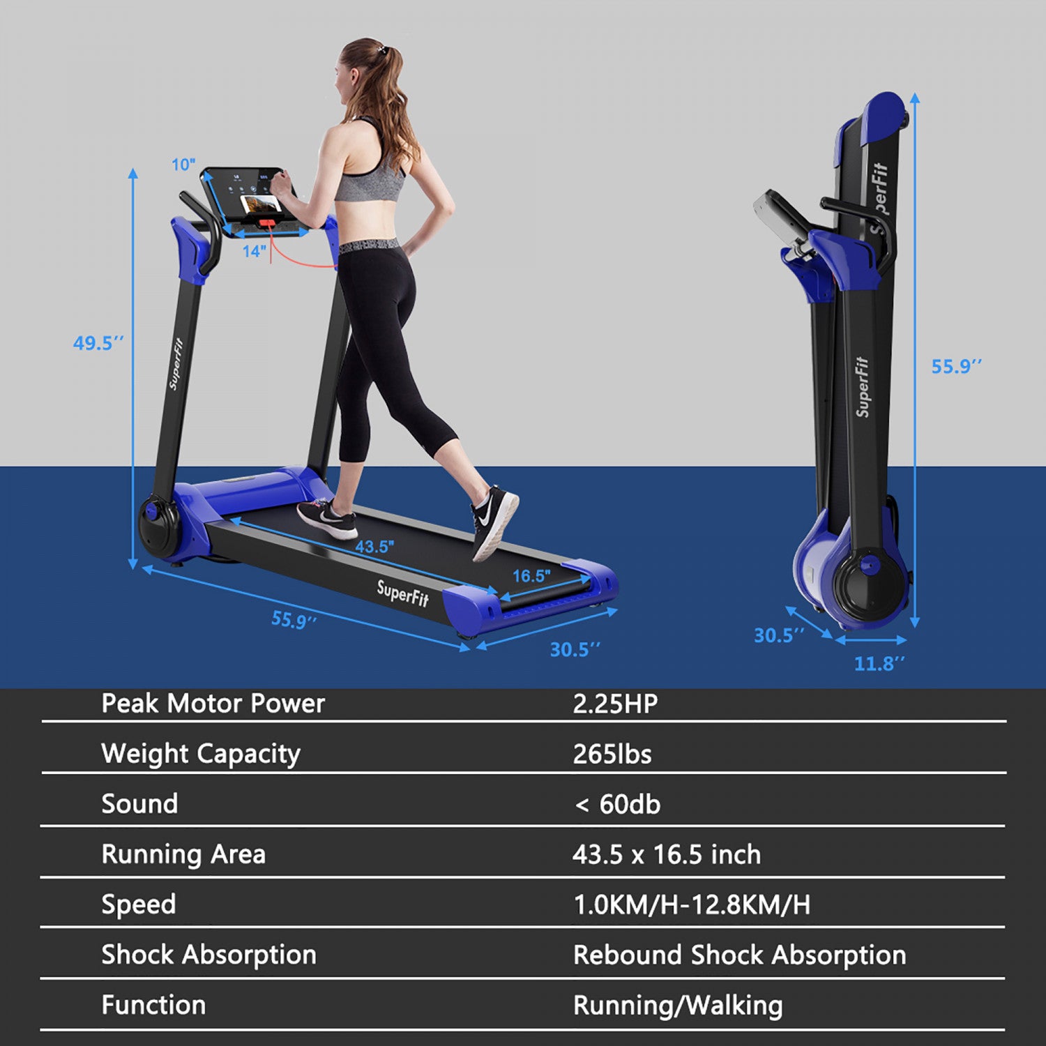 | Key Features | Puissant moteur silencieux de 2,25 CV ameliorant grandement les effets sportifs. Connexion du tapis de course au telephone via Bluetooth pour ecouter de la musique. Reglage rapide de la vitesse a 5 ou 8 km/h. Piste de course amortissante a 5 couches pour reduire les chocs durant le sport. 4 roues de transport flexibles pour faciliter le deplacement et le rangement. Cle de securite utilisee pour le freinage d'urgence et eviter les accidents de securite. Support de telephone pour regarder des films tout en courant. Conception integree sans bien d’installation pour une utilisation facile. Piste de course elargie a 16,5 pouces pour courir librement. Coussinets en caoutchouc pour reduire considerablement les impacts. Ecran LED pour garder un œil sur la vitesse, la distance, le temps, le nombre de pas et les calories en temps reel. |