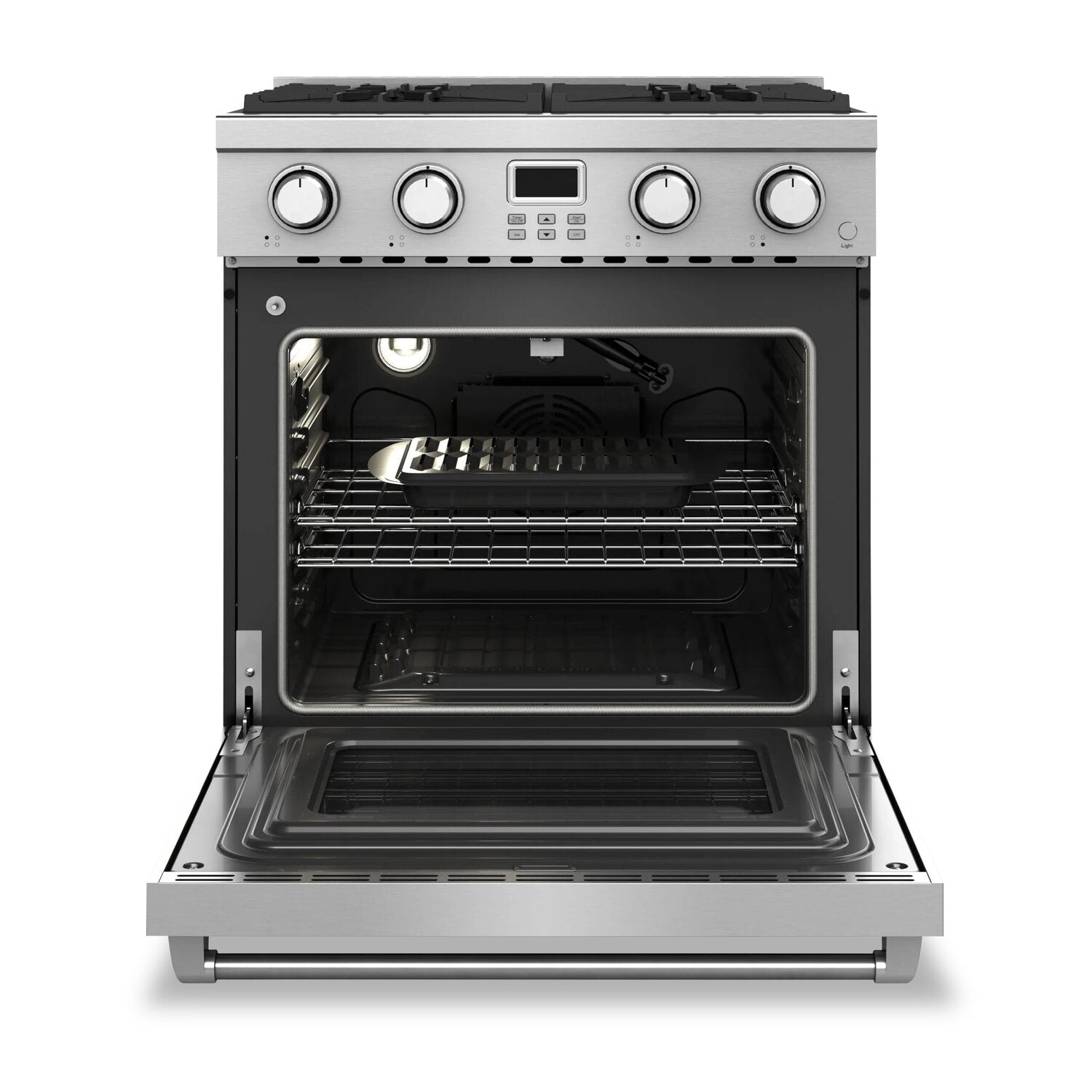 Quatre brûleurs scellés : Plateau de 1 pièce en porcelaine pour les dégâts : Ventilateur à convection : Grilles de cuisson continues en fonte : |