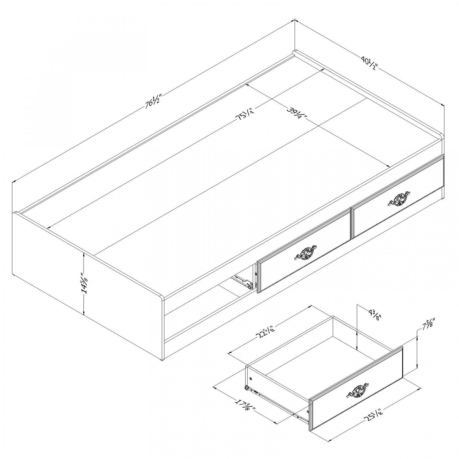 Largeur : 40,5 po (102,9 cm) Hauteur : 14,75 po (37,5 cm) Profondeur : 76,5 po (194,3 cm)