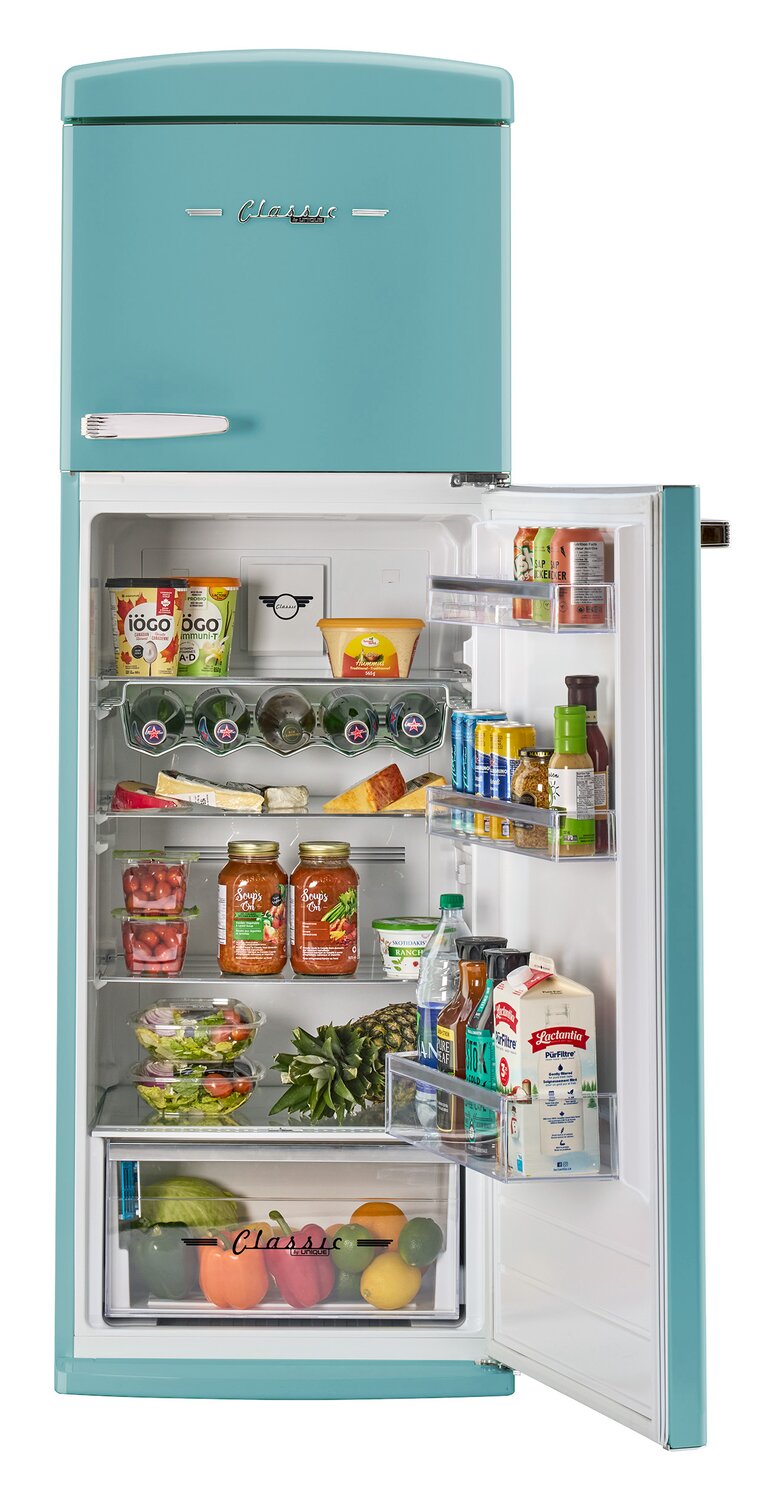 Réfrigérateur de style rétro à congélateur supérieur : Tablettes réglables en verre : Refroidissement sans givre : Filtres UltraFresh : Appareil homologué ENERGY STARMD : Support à vin : |