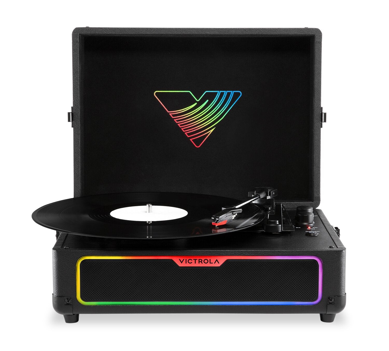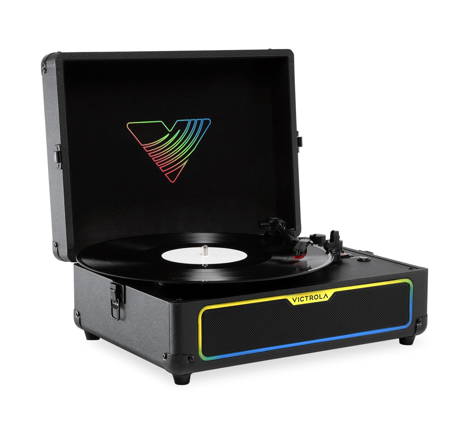 Effets lumineux GlowRGBMC de Victrola : Modes sonores réactifs au rythme de la musique : Son stéréo amélioré : Sortie Bluetooth : Lecture en continu de musique avec Bluetooth : Connectivité polyvalente : Conception compacte en forme de valise : |